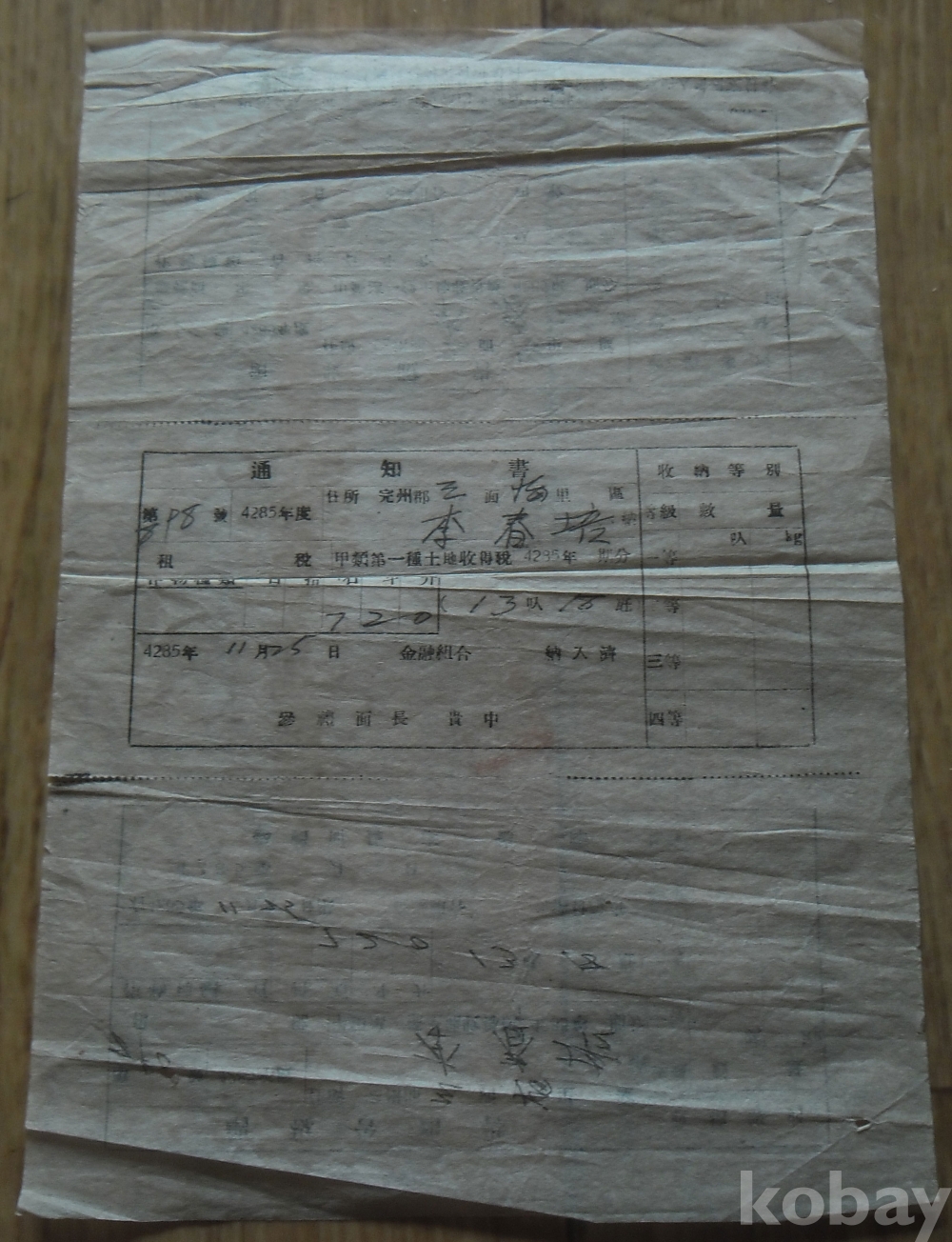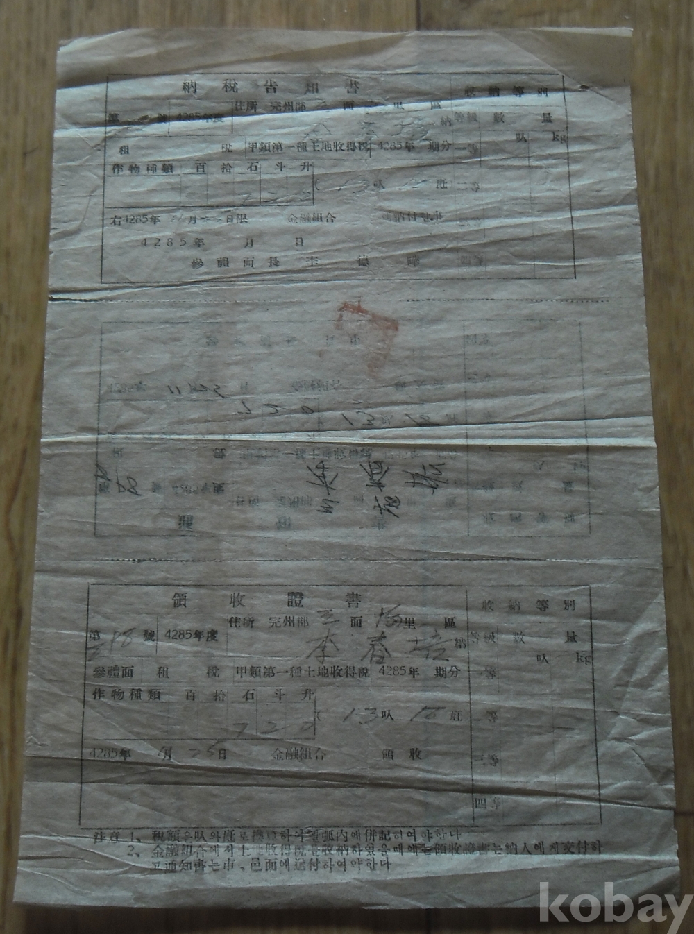 1952년 완주군삼례면 납세고지서/영수증