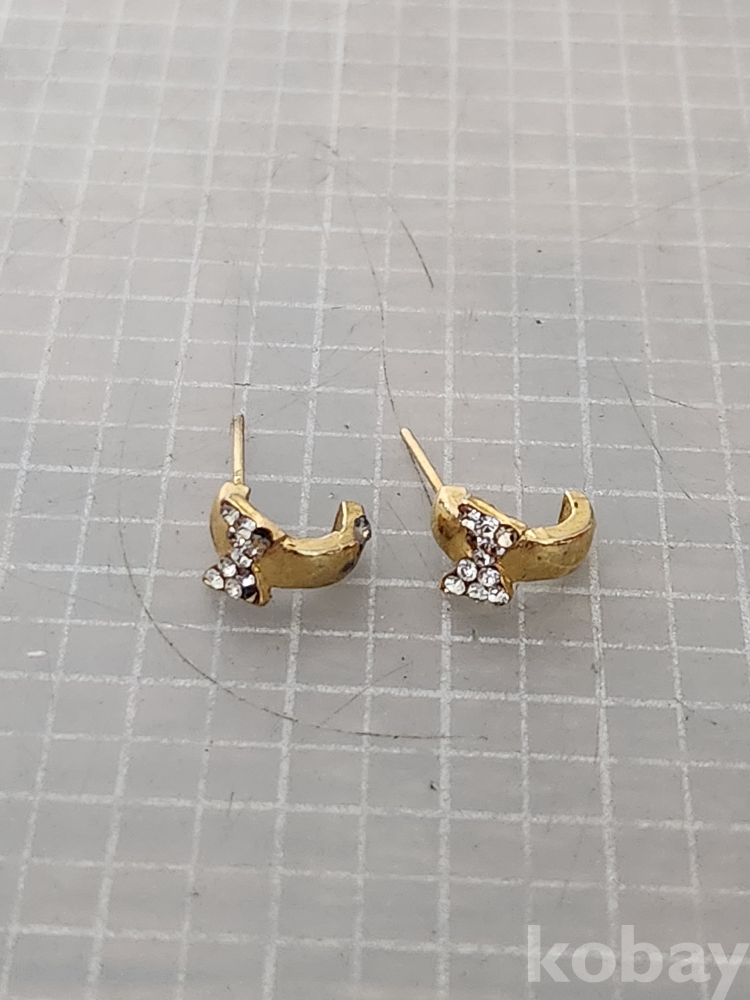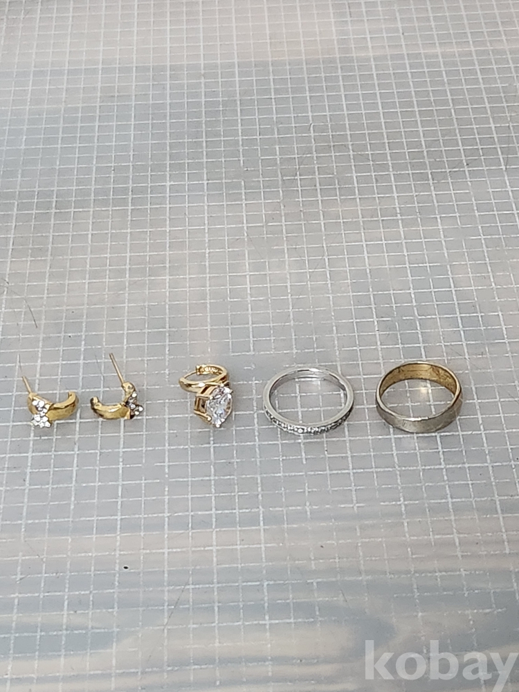(땡처리) 다양한 디자인의 귀걸이와 반지 세트입니다. 금색 귀걸이 2쌍과 은색 반지 1개, 금색 반지 1개로 구성되어 있습니다. 귀걸이 중 한 쌍은 작은 큐빅이 박혀있고, 다른 한 쌍은 큰 큐빅이 달린 드롭형 디자인입니다. 은색 반지는 큐빅이 박힌 디자인이며, 금색 반지는 심플한 디자인입니다. 전체적으로 사용감이 있으니 사진을 잘 확인해주세요.
