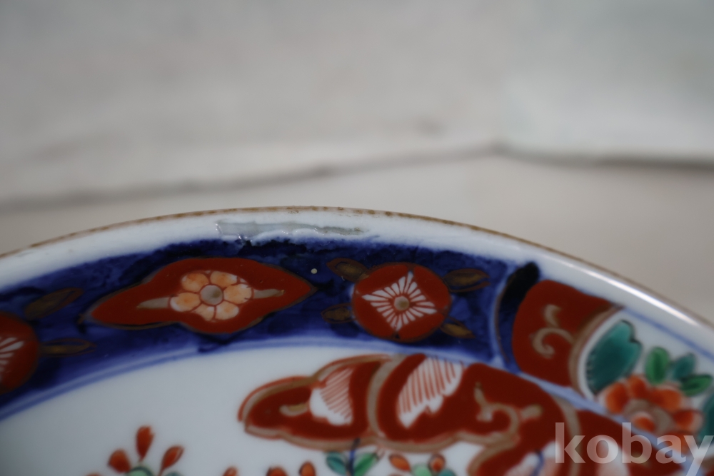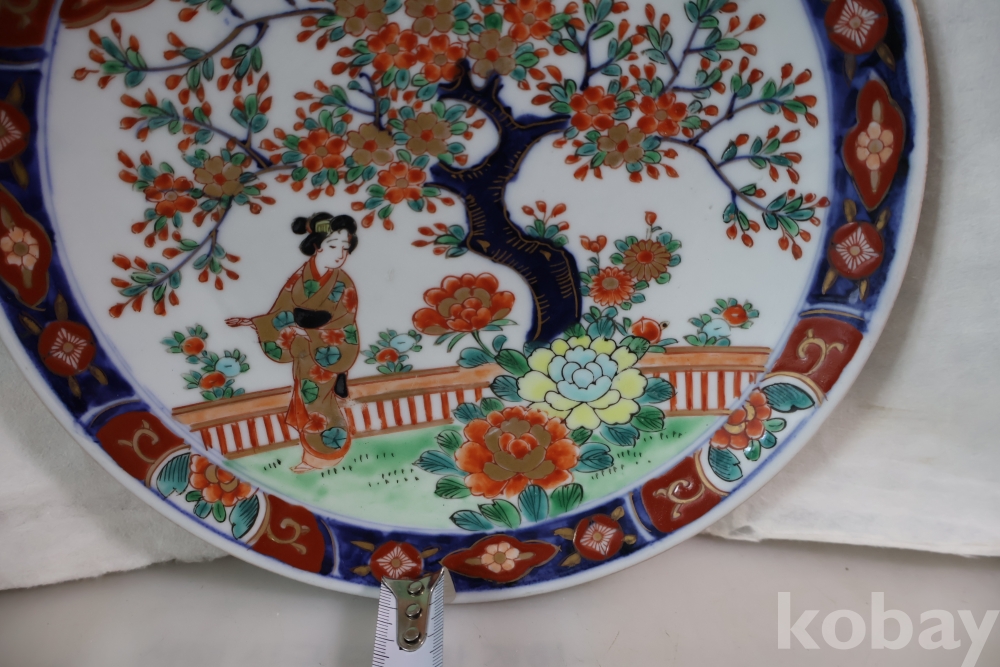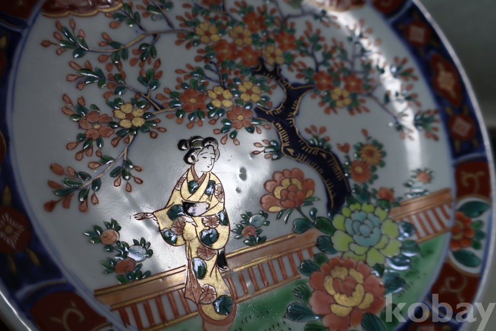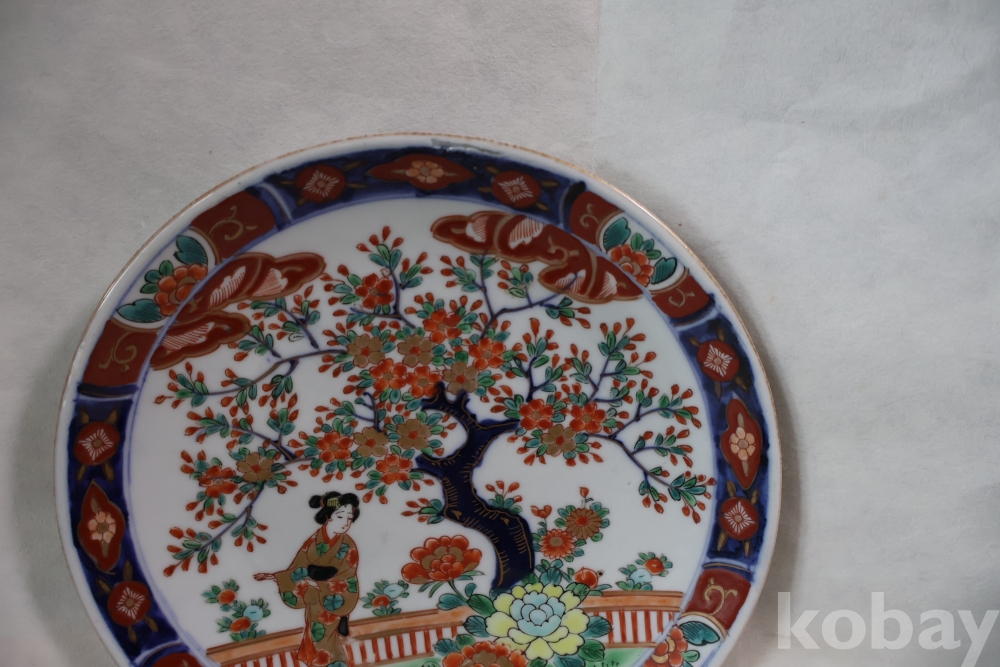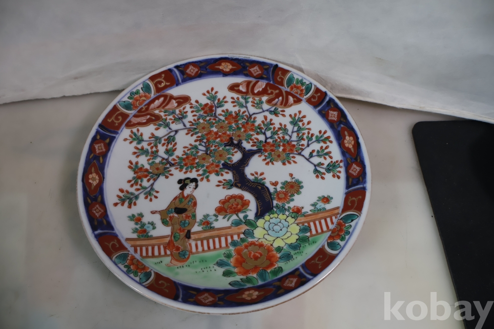 이마리 접시 게이샤 임니다 멋진 디자인 두터운 색감 등등 1930대 이후 만든 명품 도자기 수출 도자기 임니다 소성당시 생긴 들어간?곳이 보임니다 10번 두터운 색감 특이한 그림을 가진 명품 임니다