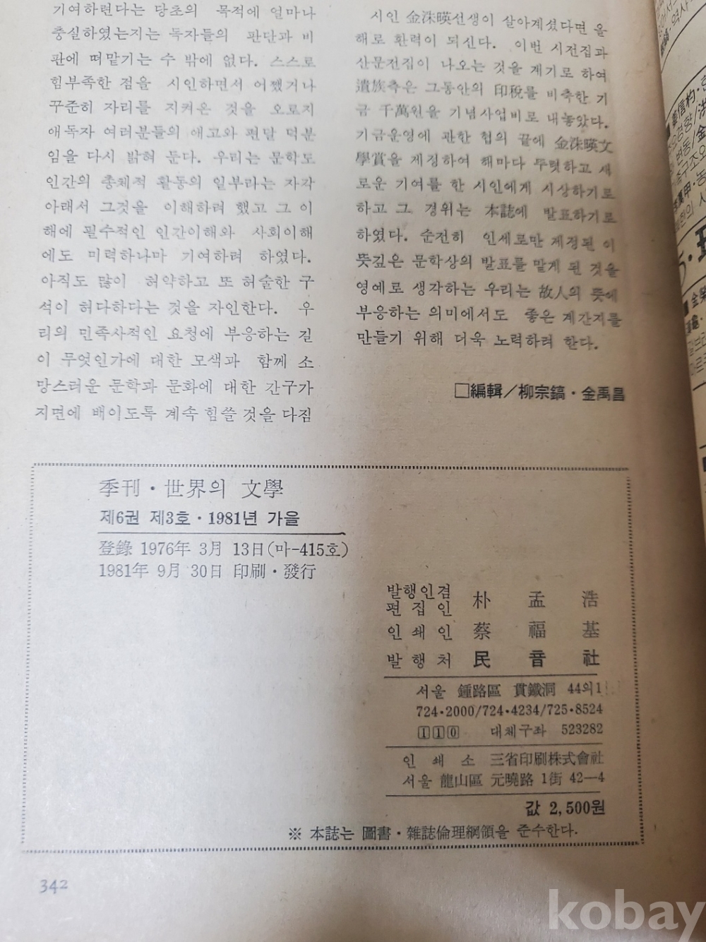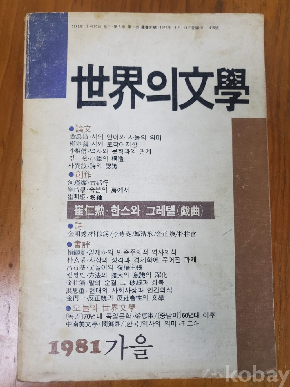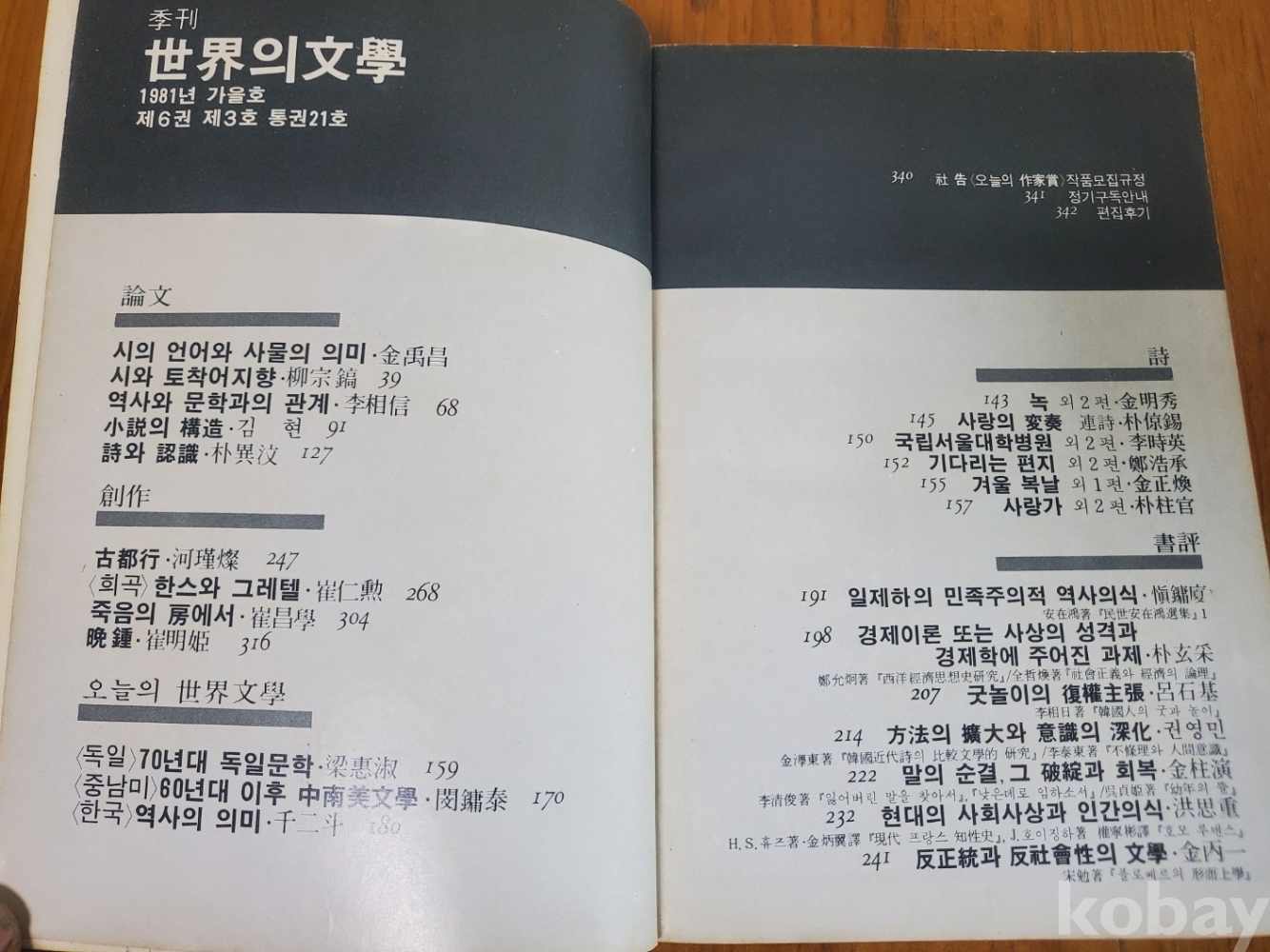 1. 세계의 문학(통권 21호), 민음사, 1981년, 346쪽, 상태 상, 사진 참조