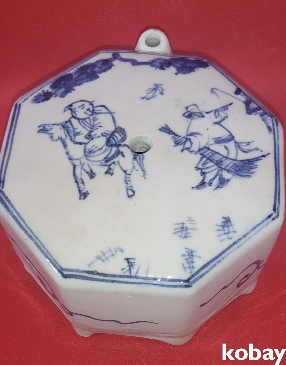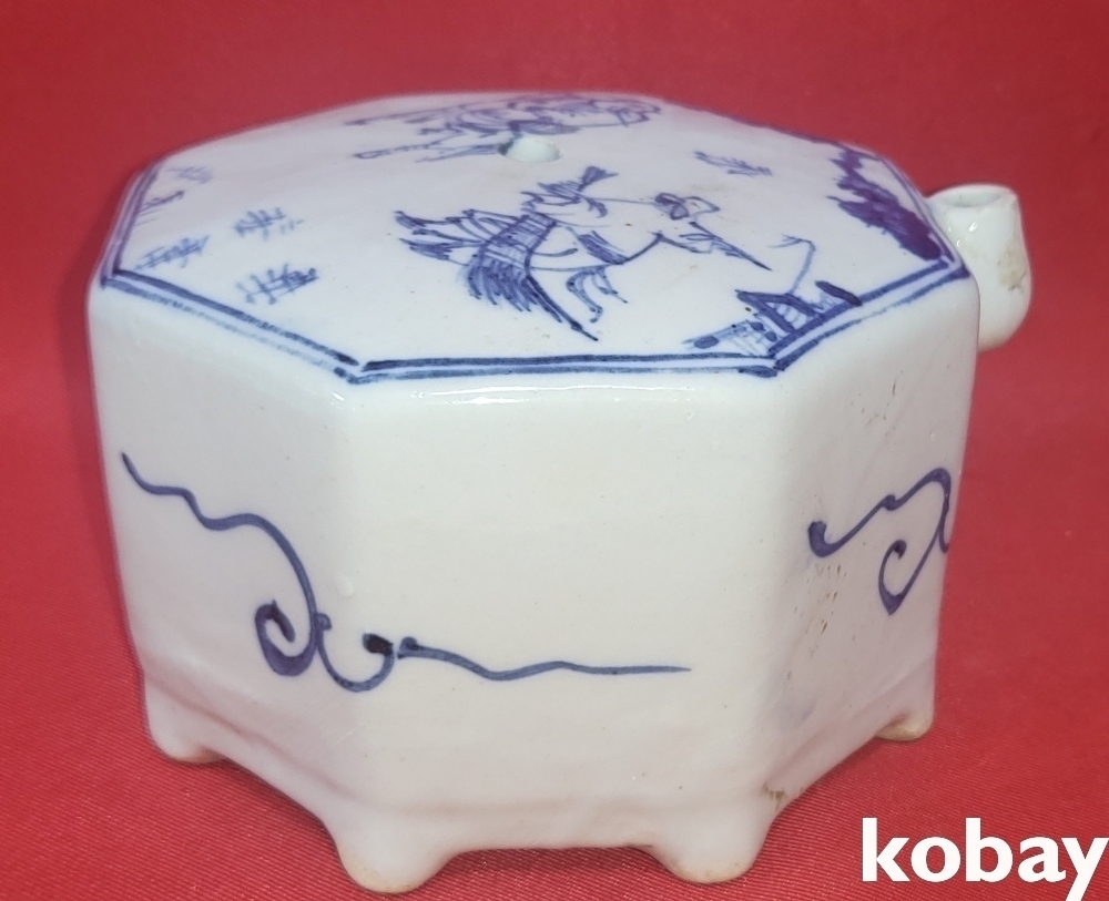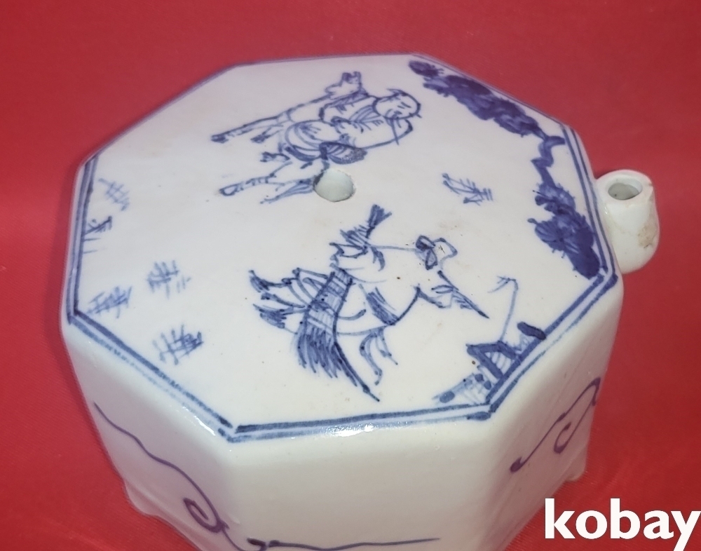 청화 송화(松下) 기마 인물문 팔각형 큰 연적으로 도안이 아주 아름답습니다,