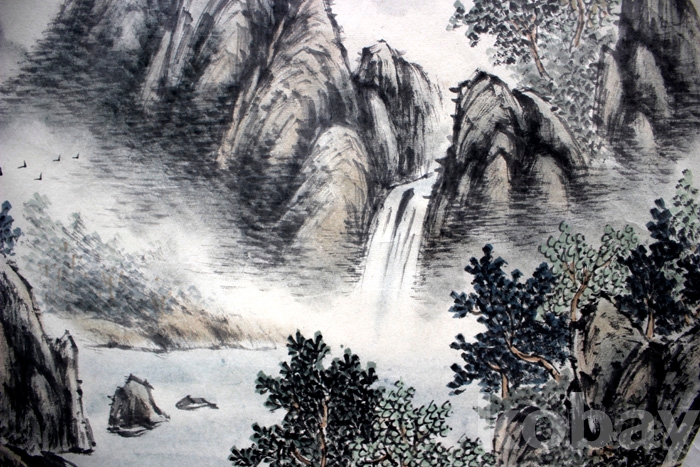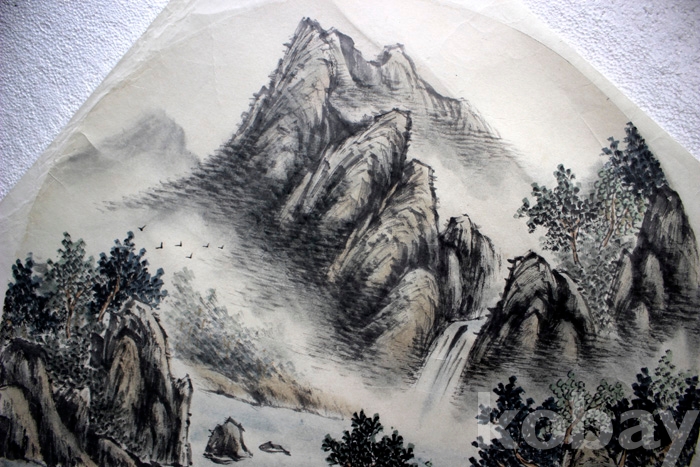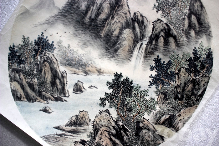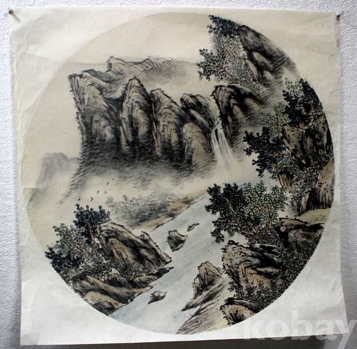작가미상의 원형 하경산수 1점 - 폭포가 있는 강가의 풍경