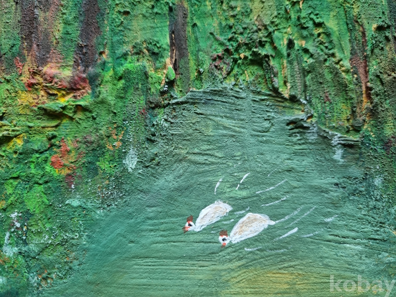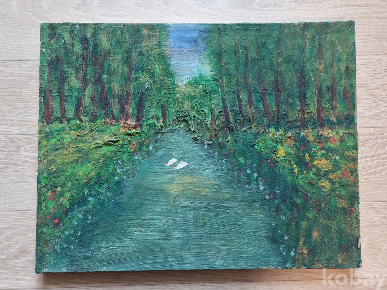 작품 속 숲과 물, 그리고 두 마리의 백조는 평화와 생명의 조화를 상징하며,