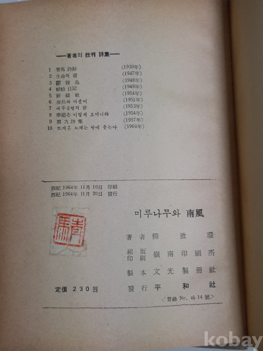 미루나무와 남풍-유치환 시집 1964초판 평화사 발행