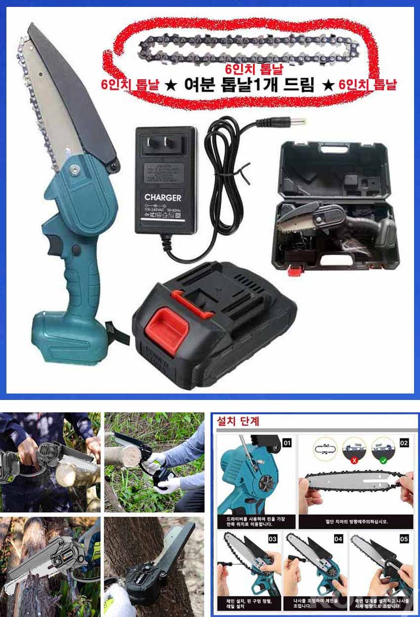 새것이며 , 밧데리1개, 아답터, 체인톱날1개, 공구, 이동프라스틱가방집 드림