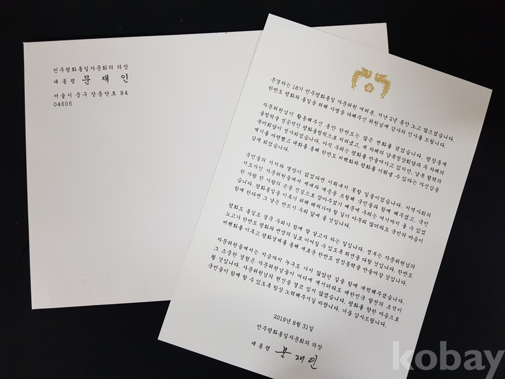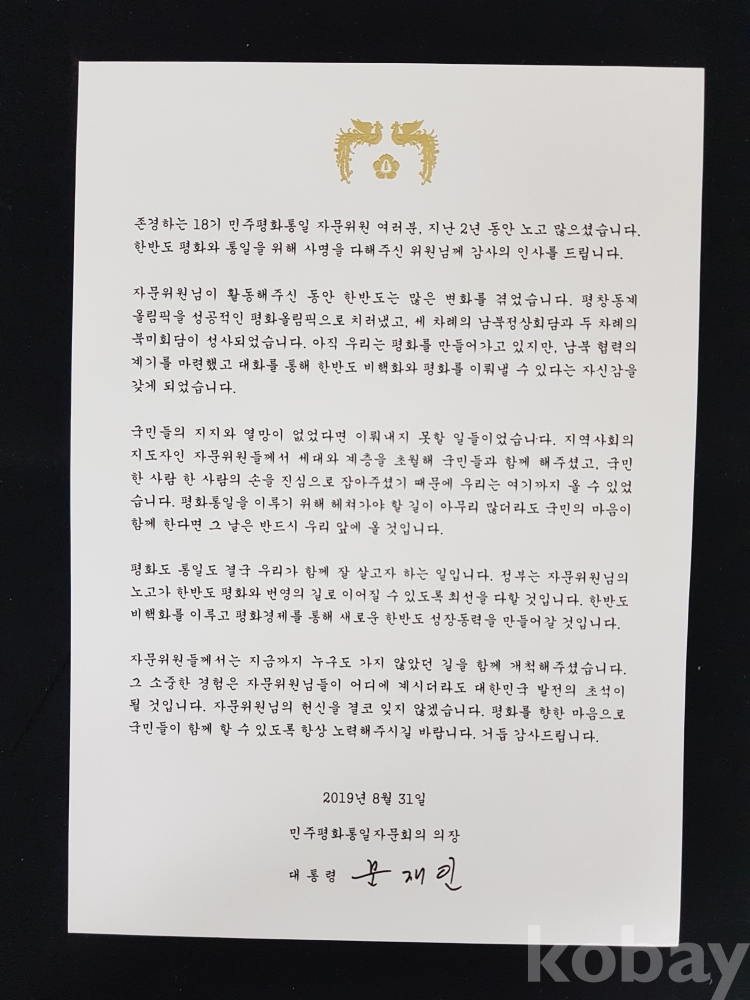 - 2019년 문재인 대통령 제 18기 민주평화통일자문호의 감사 서한