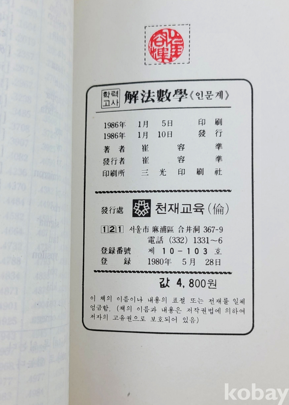 물 품 명 | 학력고사 해법수학(인문계) : 개정판 / 총1권 / 최용준 / 1986년 초판 / 천재교육 |