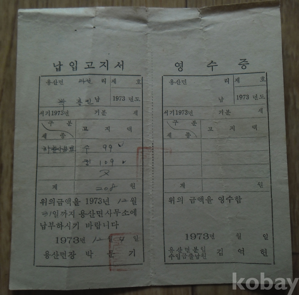 1973년 영동군용산면 하천사용료 납입고지서