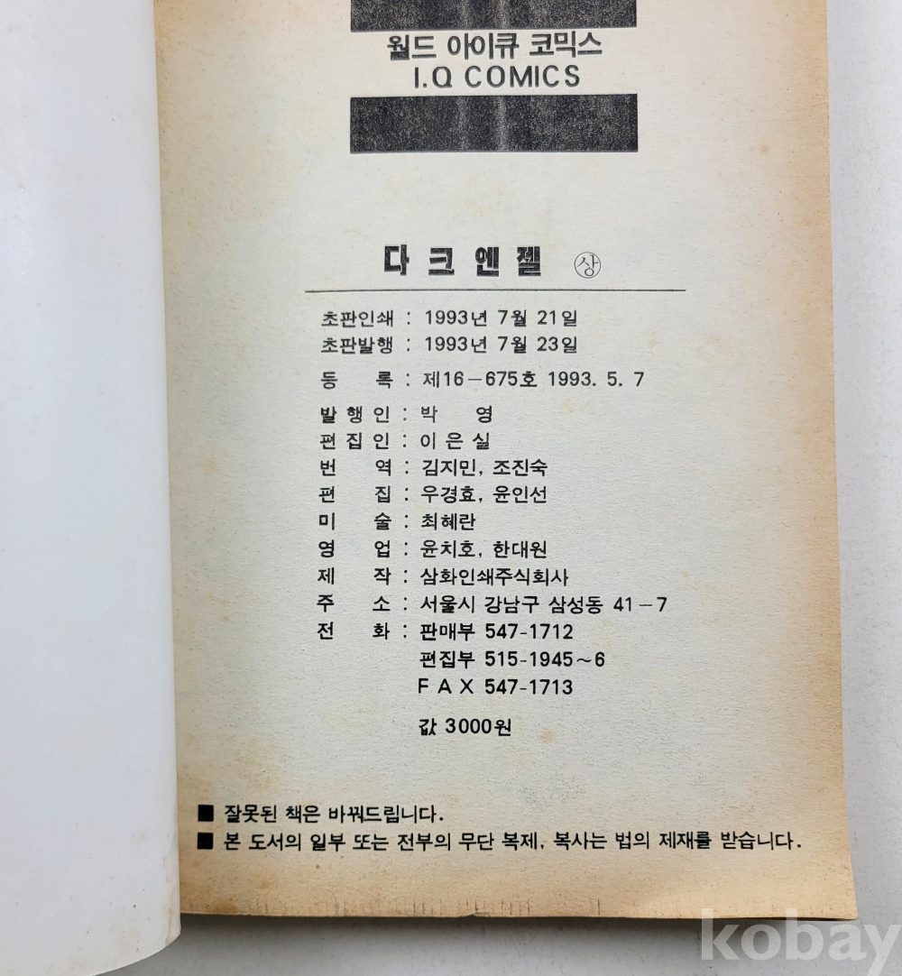 물 품 명 | 다크 엔젤(상,하)완결 총2권 / 아이큐코믹스 / 1993년 초판 / 월드문화 |