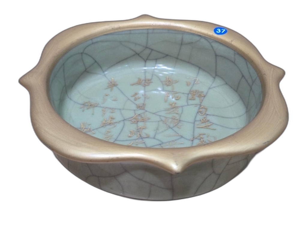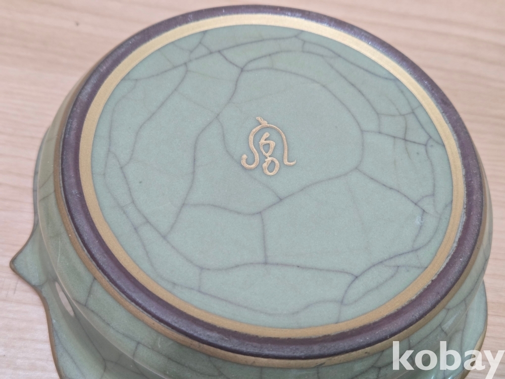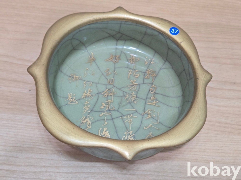 글씨가 있는 꽃 모양 필새 도자기입니다.