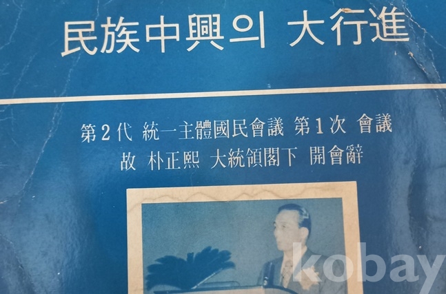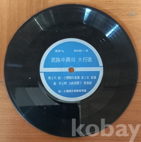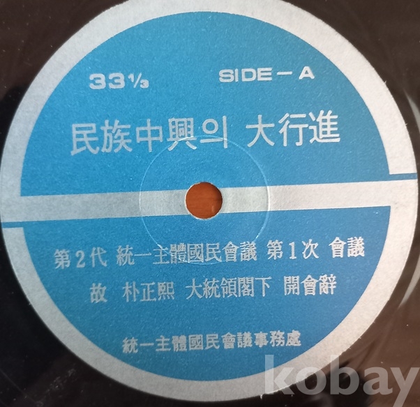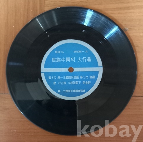 오랜만에 참 귀하게 얻은 음반입니다. 세상에 이 음반이 있는줄은 진작부터 알았으나 내손에 넣기까지는 10여년도 넘게 흘렀지요. 그간 찿는 마음을 아는지 모르는지? 세상 어디에서도 찿아 볼수가 없었으니 그리고 옛날에 처음 한번 스쳐지나 봤을 때 나는 이 음반이 박대통령 생전, 그러니까 6~70년대 초에 나온 음반인줄 알았는데 오늘 자세히 보니 제작일자가 없어 정확히는 몰라도 “故 朴正熙 大統領閣下 開會辭”로 적힌걸 보면 박대통령 사후, 79년도 이후 80년대 초반에 만들어진걸로 보이네요. 쟈켓의 뒷면에 “통일주체국민회의” 마크가 인쇄되어 있고. 그리고 박대통령 사후에 나온 앨피반은 이게 유일무이하지 싶네요. 하니 년대가 좀 늦었다고는 해도 귀하기로는 더할수 없는 반이 아닐까요. 78년도 제9대 대통령선거, 이 장충체육관에서 통일주체국민회의에 의한 간접선거로 대통령 당선후 다음해 10월 청와대옆 궁정동 안가 만찬장에서 수하인 당시 김재규 중앙정보부장의 흉탄에 서거하고.. 한편 사람들은 이때 선거를 체육관선거라고 비아냥 되기도 했다하고..