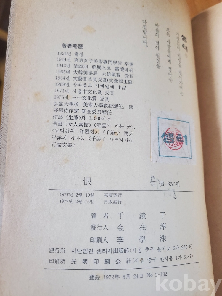 1. 한(恨), 천경자, 샘터사, 1977년, 324쪽, 상태 상, 사진 참조