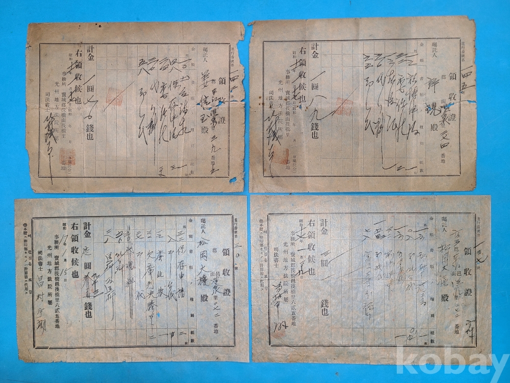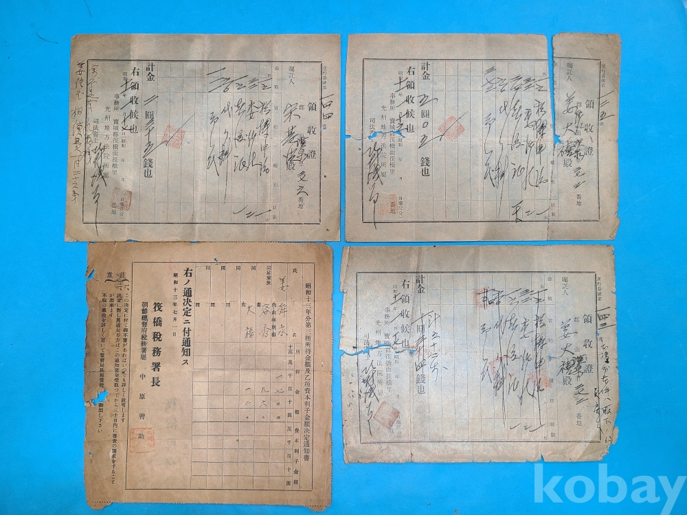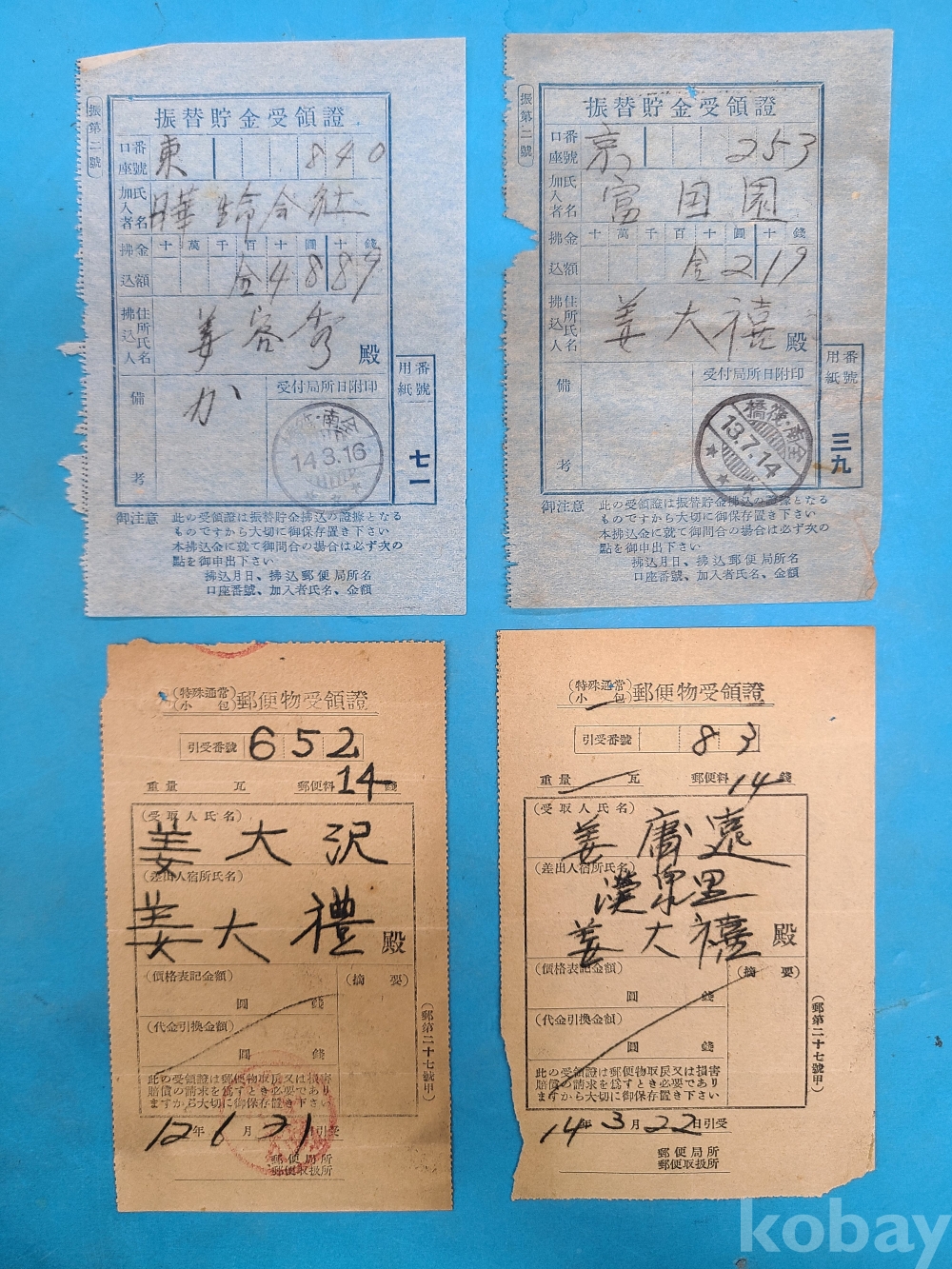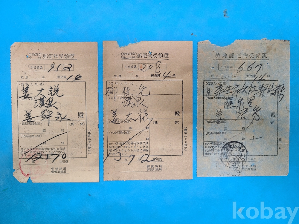 *** 벌교세무서장, 영수증, 금융전표,광일약국 자료, 소화물 영수증, 진체저금영수증, 소위체금수 령증서, 우편물 수령증, 수입인지 첩부 영수증 등
