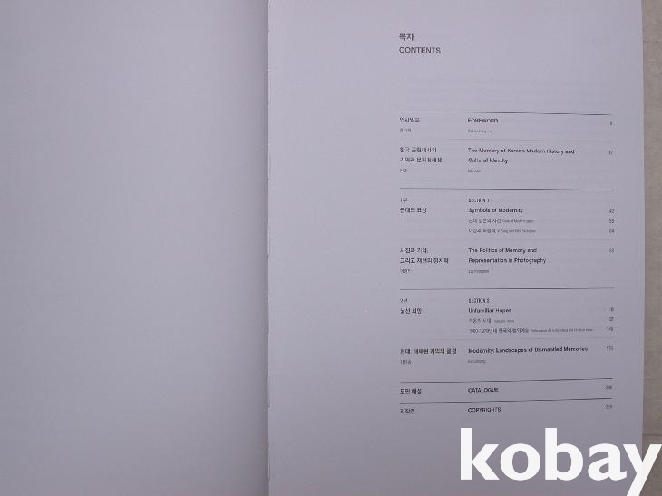 먼저 이준 부관장의 <한국 근현대사의 기억과 문화정체성>이라는 해설 논고가 있다. 모든 글은 영문으로도 함께 실려 있다. 본문은 2부로 나누어 1부 근대의 표상/사진과 기억, 그리고 재현의 정치학, 2부 낯선 희망 / 현대, 해체된 기억의 풍경로 구성하여 도판과 함께 자세한 해설을 수록하였다. 각 부에도 해설논고가 각각 달려 있고, 1부에 26, 2부에 42점의 도판이 있으며 해설문은 뒤에 따로 영문해설도 실었다.