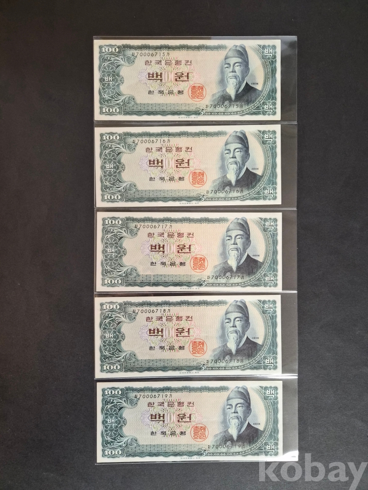 한국은행권 세종 백원 밤색지 미사용 연번호 5매 일괄 이며