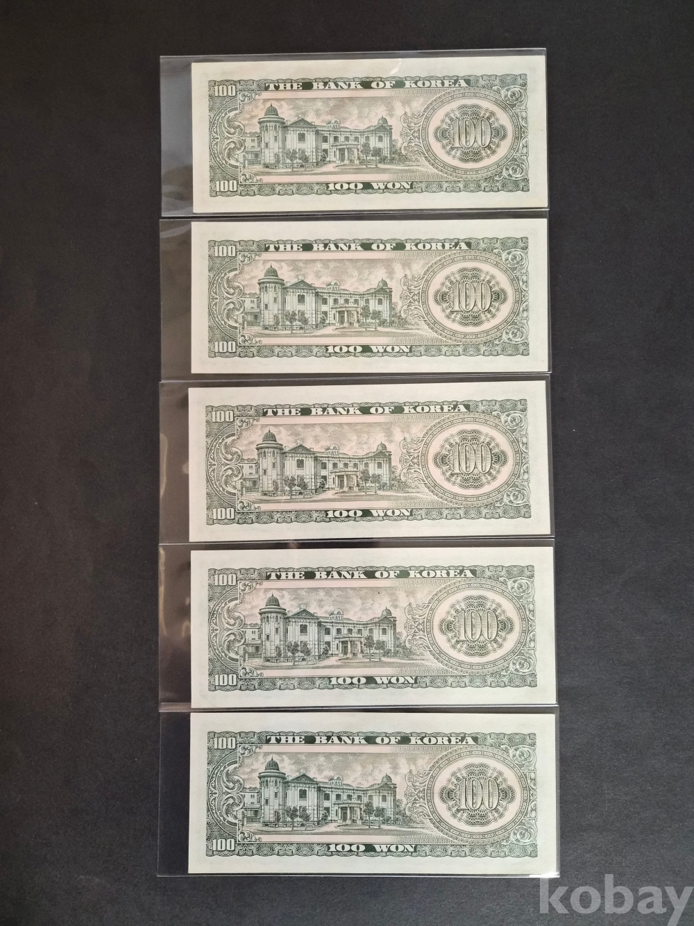 [근대사 화폐 기획전] 한국은행권 세종 백원 밤색지 미사용 연번호 5매 일괄
