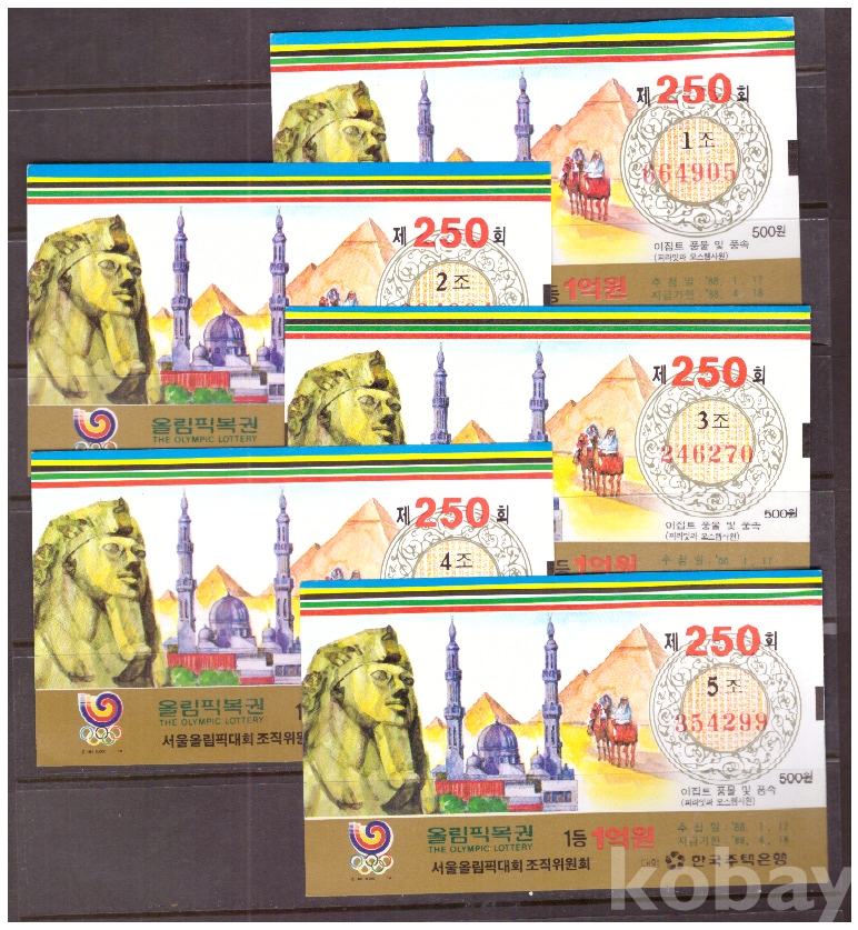 (서울올림픽) 1988 서울올림픽복권 제250회 1,2,3,4,5조 이집크 풍물 및 풍속(피라밋과 모스렘사원)