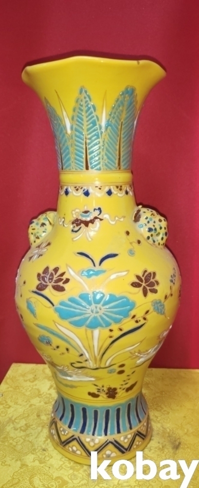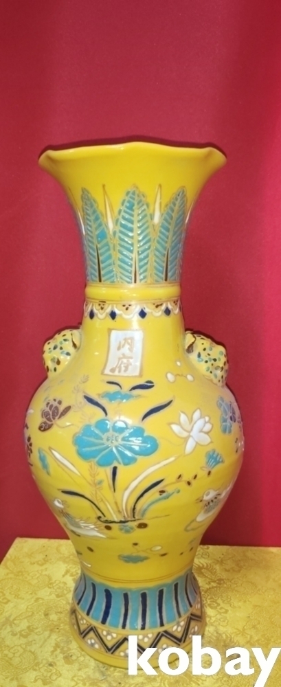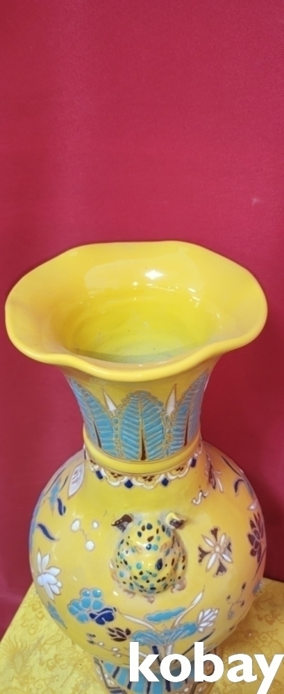 황지 연꽃 원앙새 문양 내부(內府) 양이(兩耳)화형병입니다,