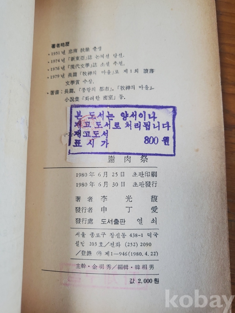1. 사육제, 이광복, 도서출판 열쇠, 1980년, 211쪽, 상태 상, 사진 참조