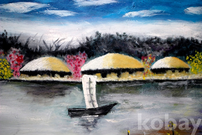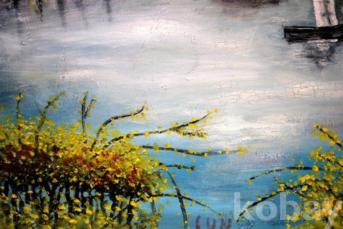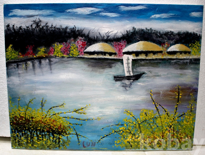(유화) 초가집이 있는 작가미상의 호숫가의 봄 풍경