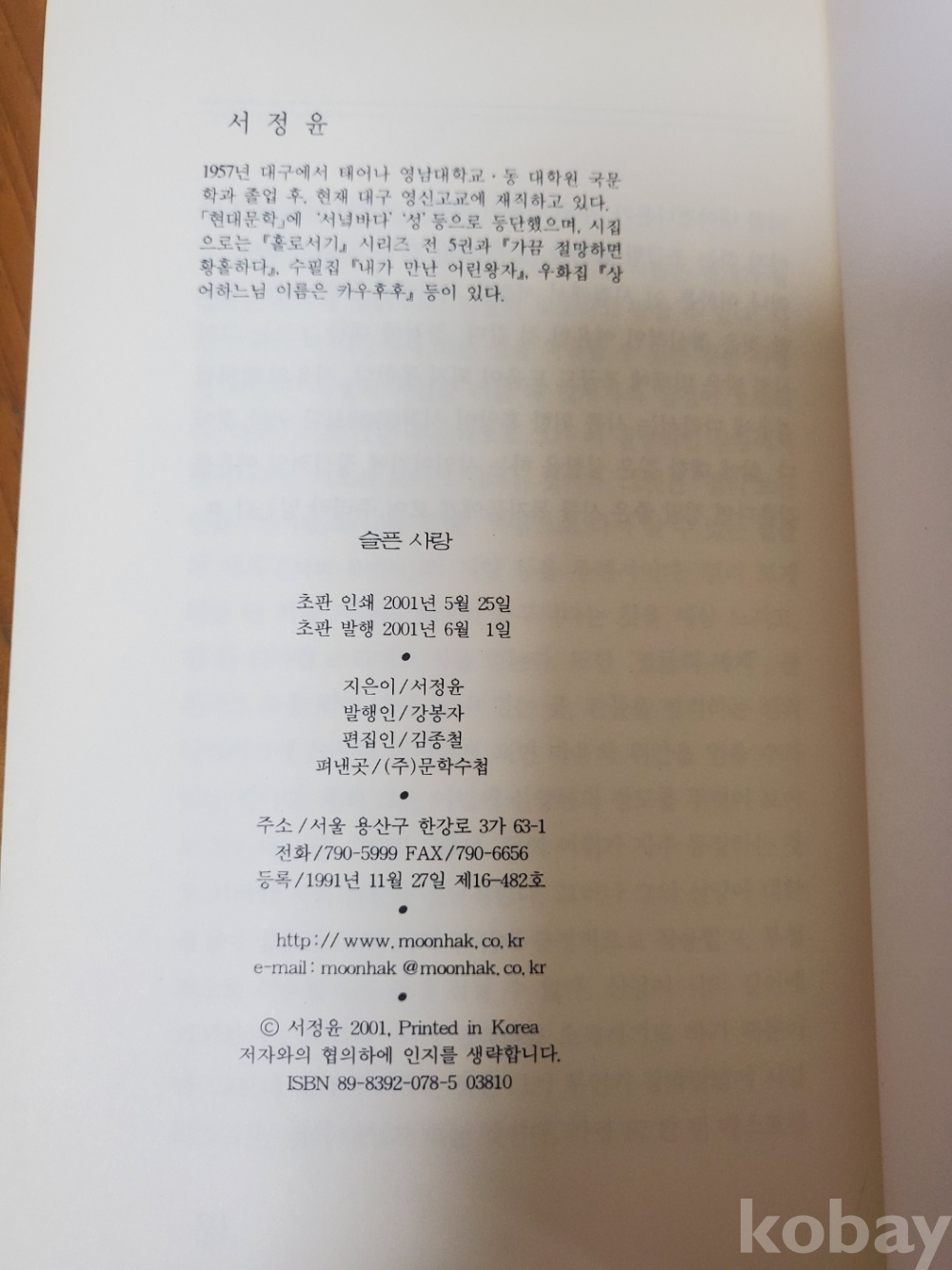 1. 슬픈 사랑, 서정윤, 문학수첩, 2001년, 127쪽, 상태 상, 사진 참조