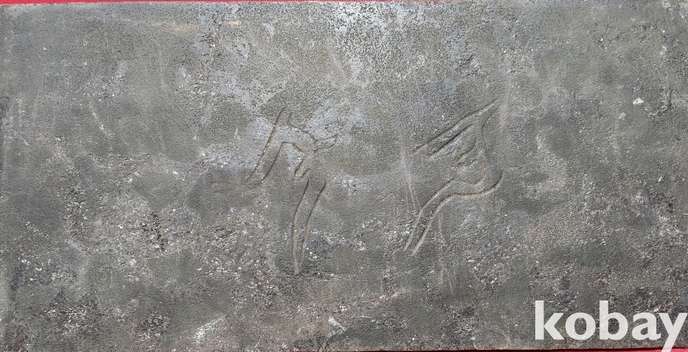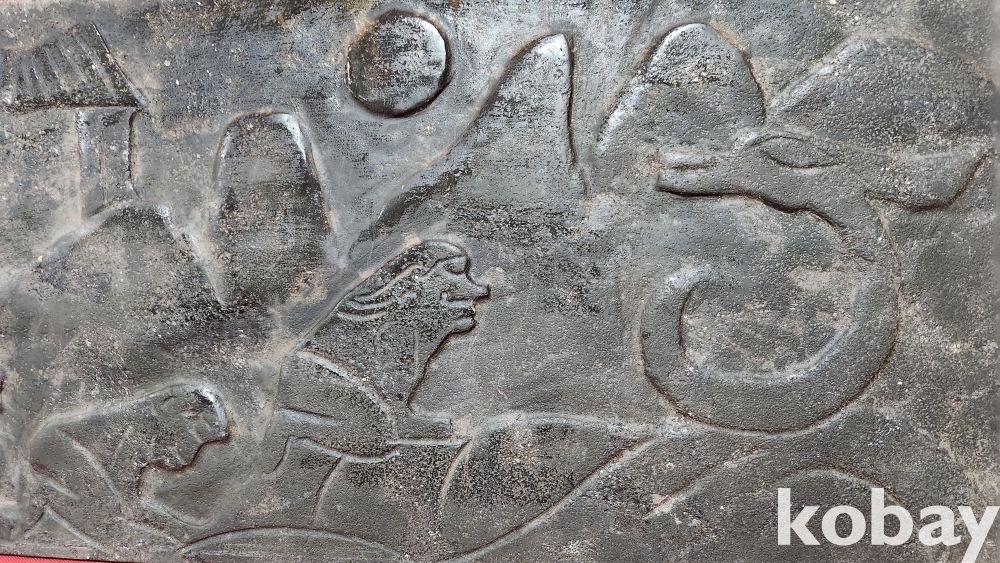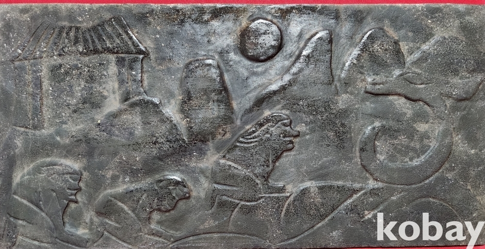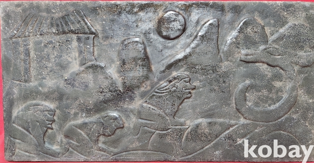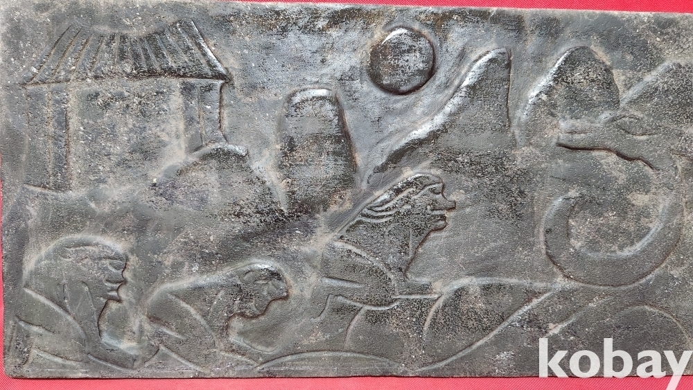 오석(烏石)으로 완성된 태양과 가옥 3명의 인물이 해마신을 섬기는 문양 전돌입니다,