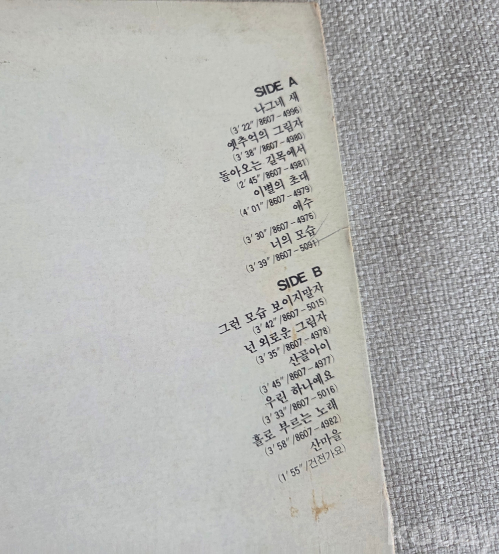| 자켓상태 | EX : 약간의 마모, 모서리 찢김 존재 | 음반상태 | NM : 개봉했으나 미사용급, 스크래치 없음 | 발매정보 | 초반 | 가사지여부 | 무 |