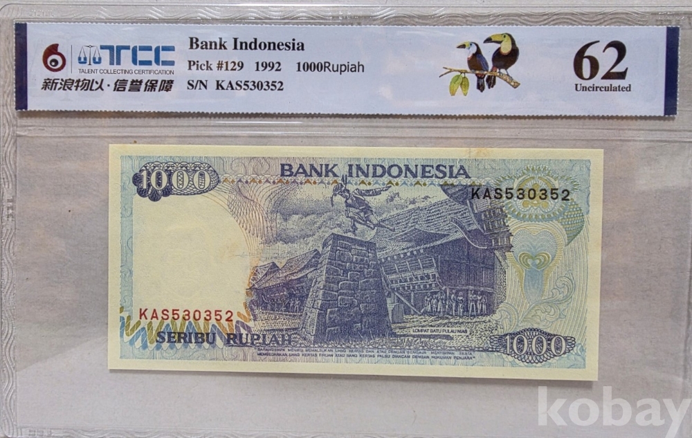 -1992년 인도네시아 1000루피아 지폐 TCC62 등급 입니다.