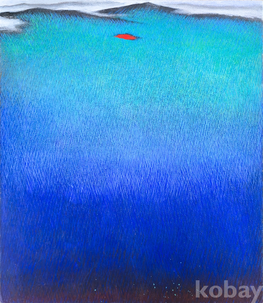 〈생명예찬〉은 깊고 넓게 펼쳐진 청색의 색면 위에 단 하나의 강렬한 붉은 포인트를 배치한 작품으로,