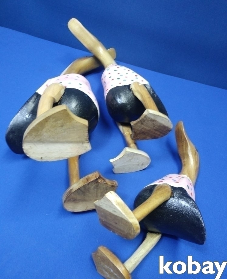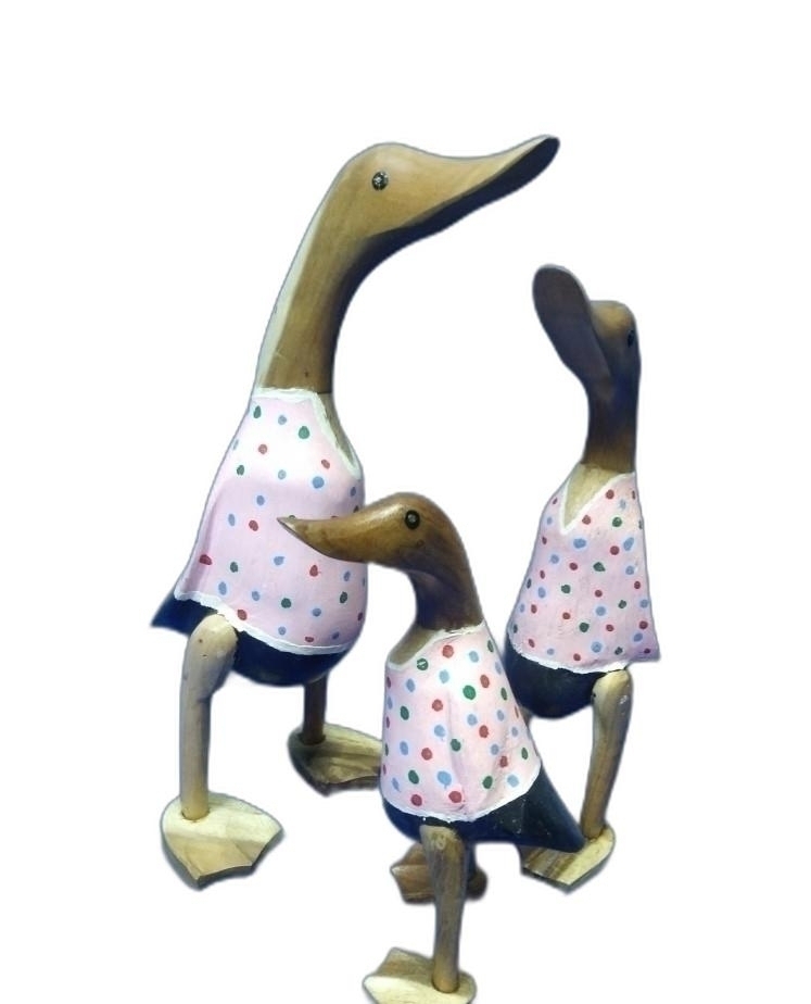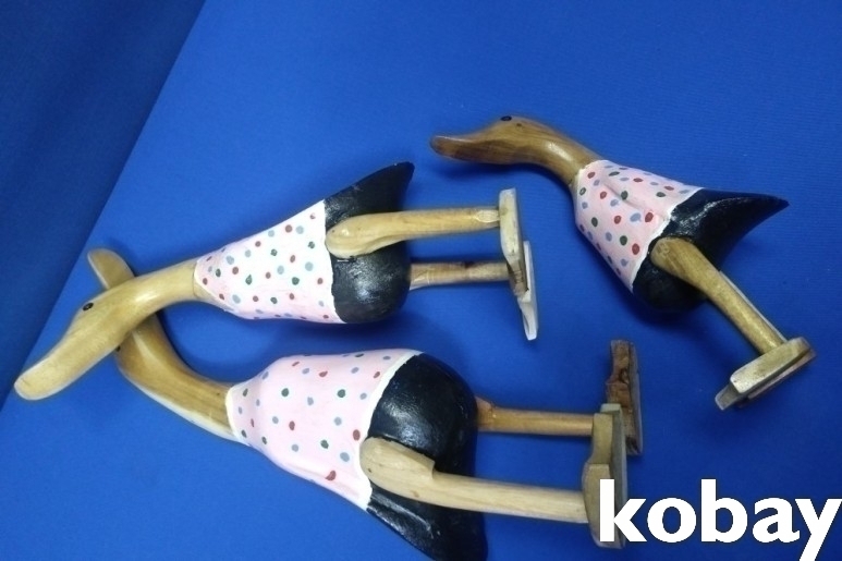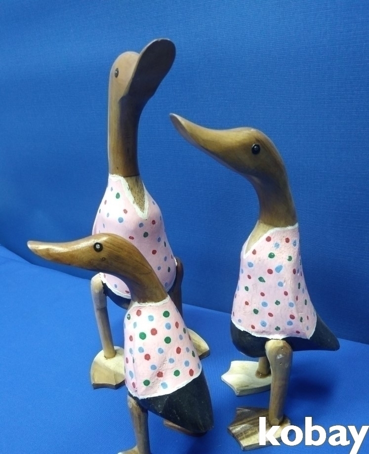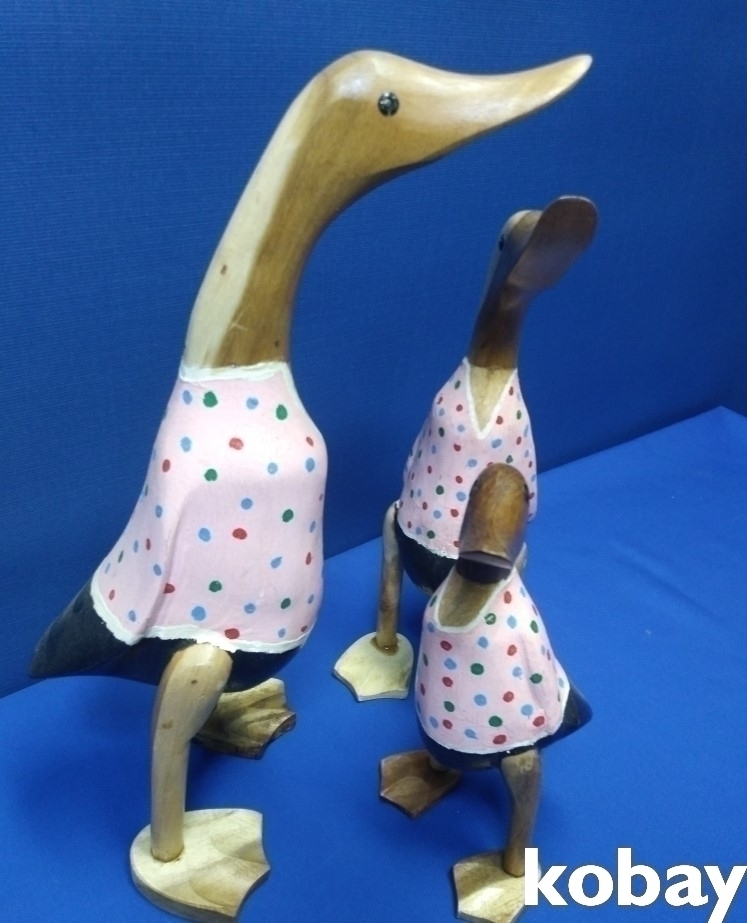 분홍 땡땡이 옷 입은 나무 오리가족 입니다.