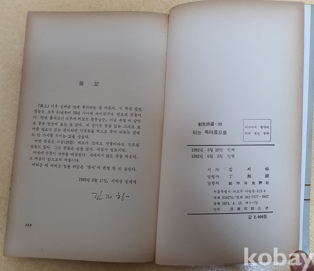 김지하 시집,창비,1982년 초판,상태는 양호 깨끗한 시집