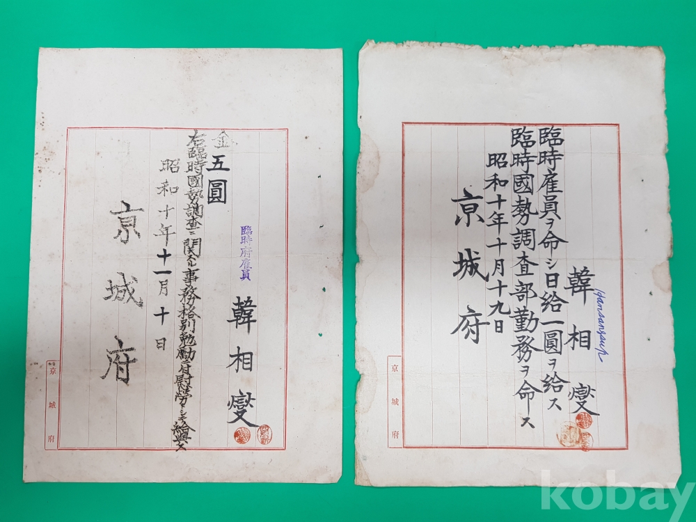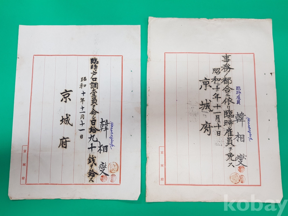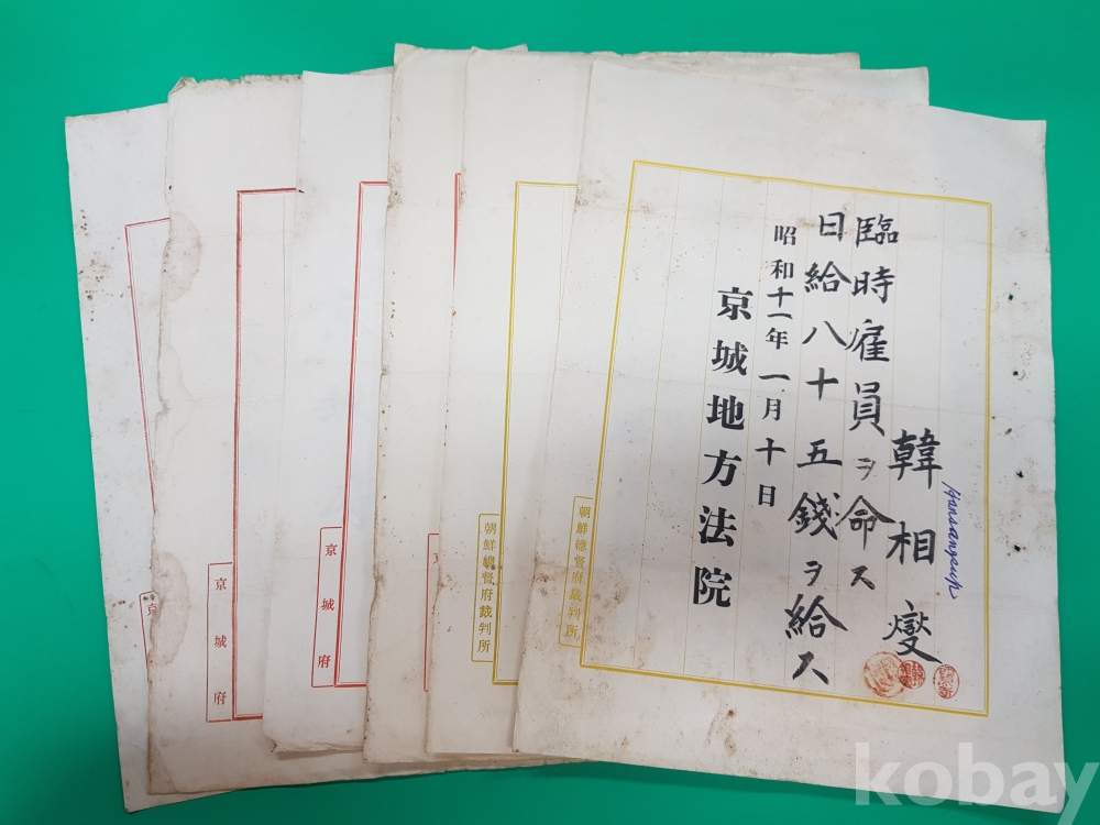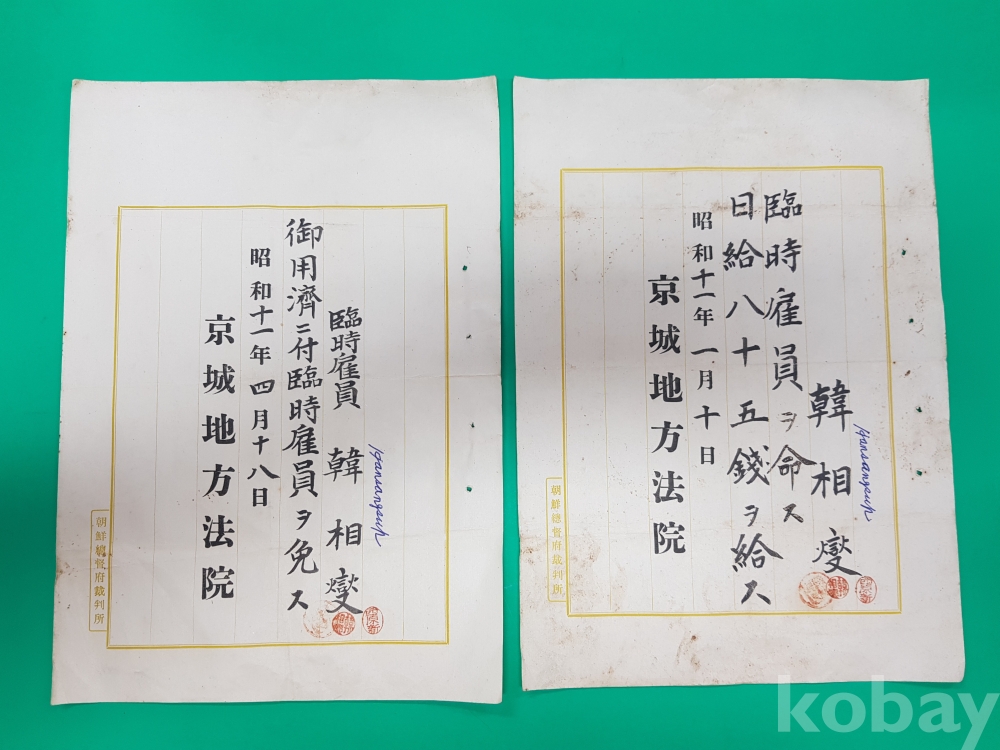 **** 일제강점기 京城府,京城地方法院 臨時雇員 임명장 1935-36년