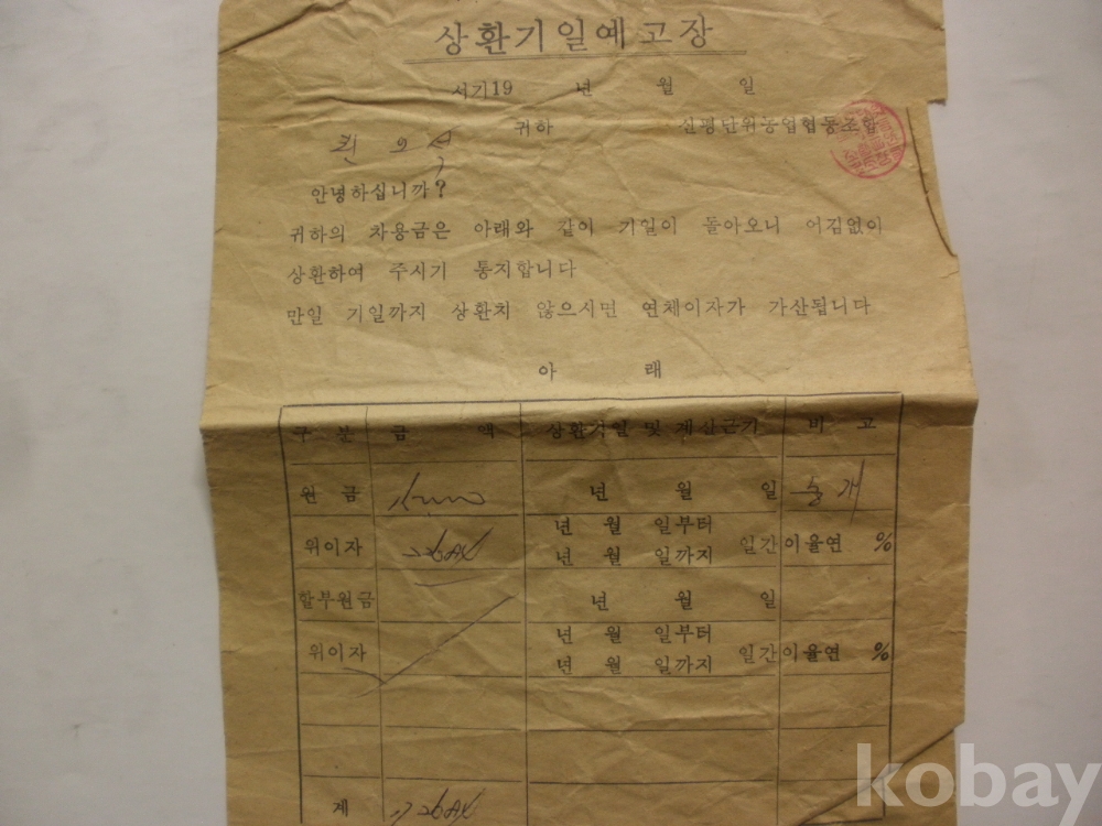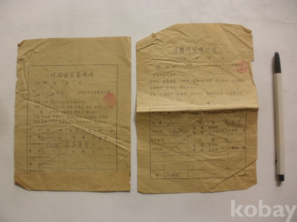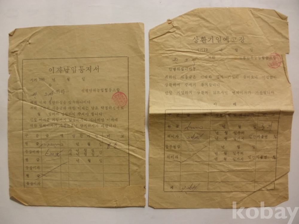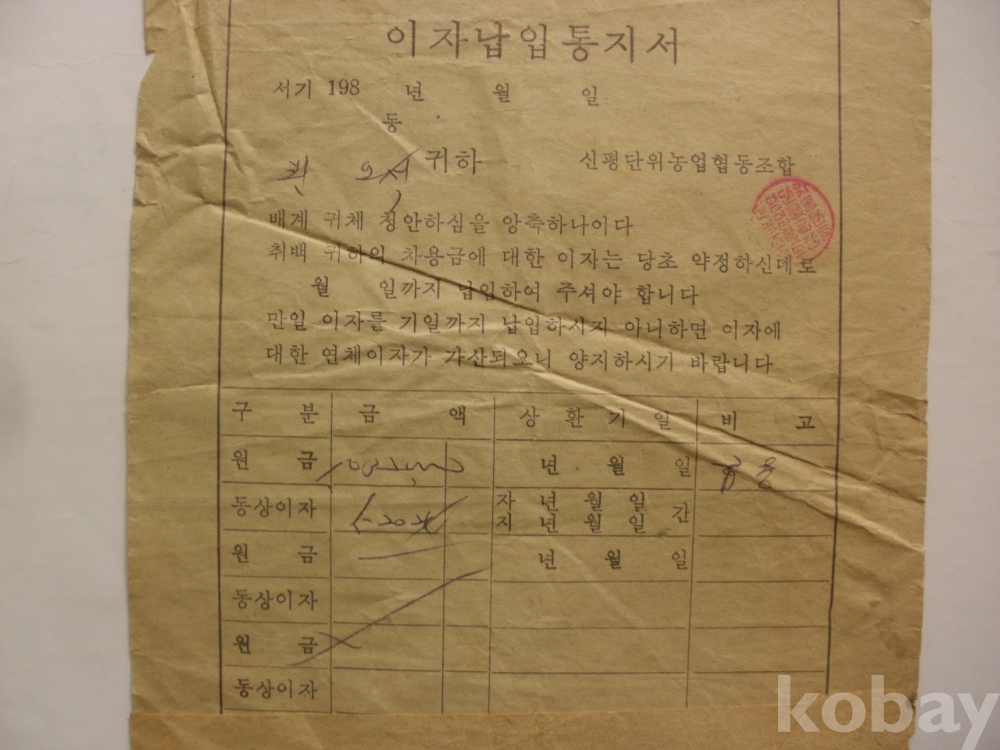 이자 납입 통지서, 상환기일 예고장 (1980년대, 신평단위농협)