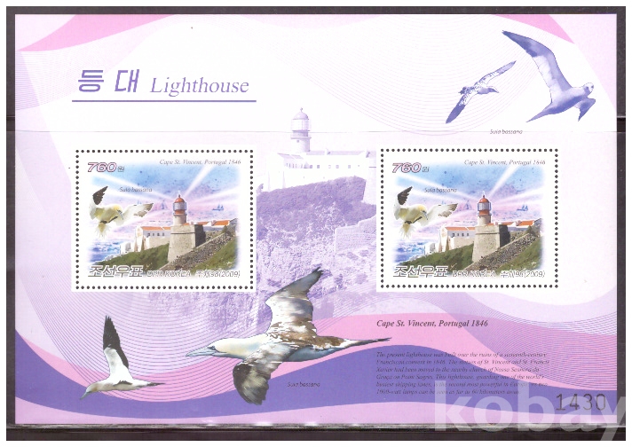 (등대) 북한 2009.10.24 뽀르뚜갈 케이프 쎄인트 빈센트등대와 갈매기 sheet of 2 MNH