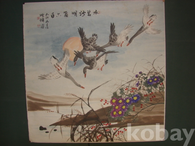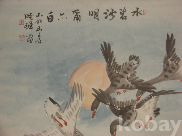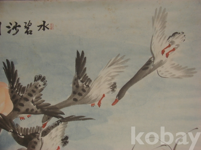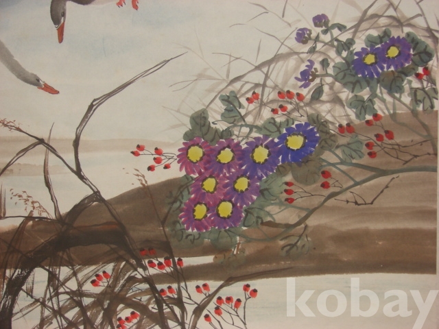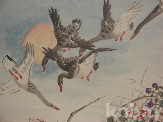 <노안도>: 기러기는 동양의 옛 산수화에 있어 가을 경치를 대표하여 ‘소상팔경도’ 가운데 ‘평사낙안(平沙落雁)’이 포함되기도 한다. 노안도(蘆雁圖)의 노안을 노안(老安)과 같은 의미로 여겨 노후의 안락함을 기원하는 그림으로도 그렸다.