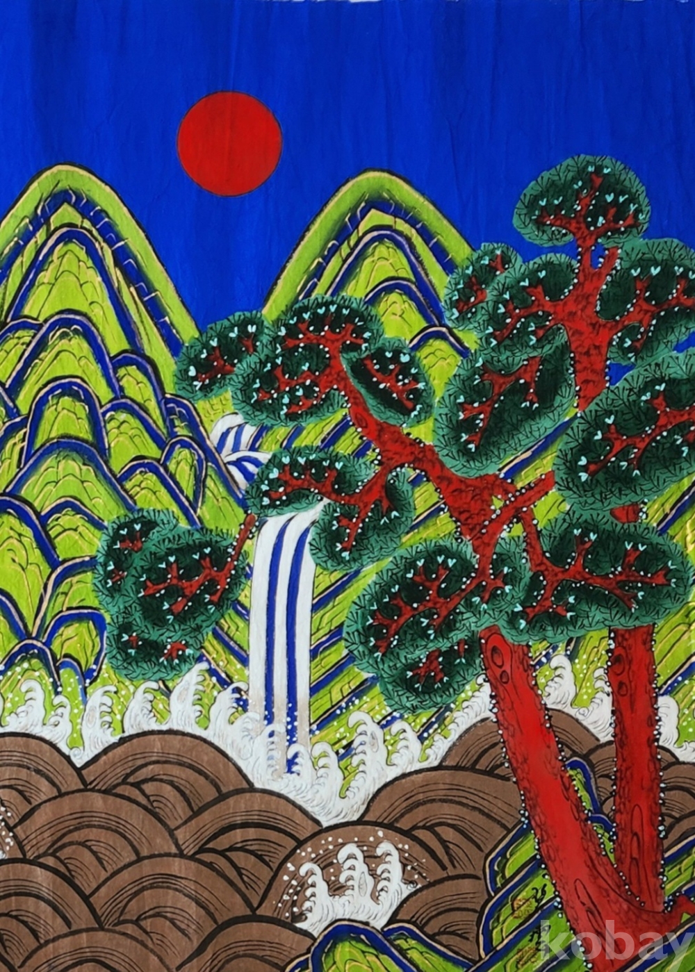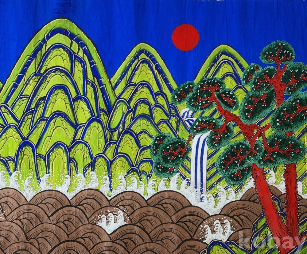배경에다 폭포가 두줄기 흐르는 다섯 봉우리의 산과 맨 앞에 심어져 있는 소나무로 이루어