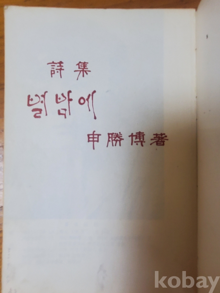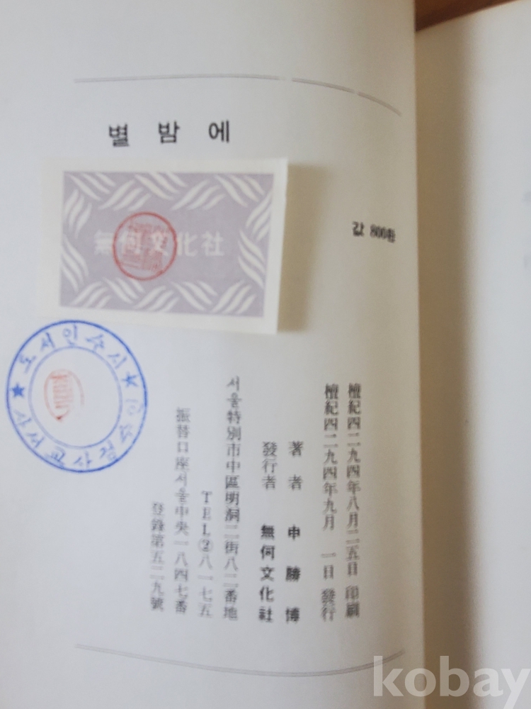 1. 별밤에, 신승박, 무하문화사, 1961년, 122쪽, 상태 상, 사진 참조