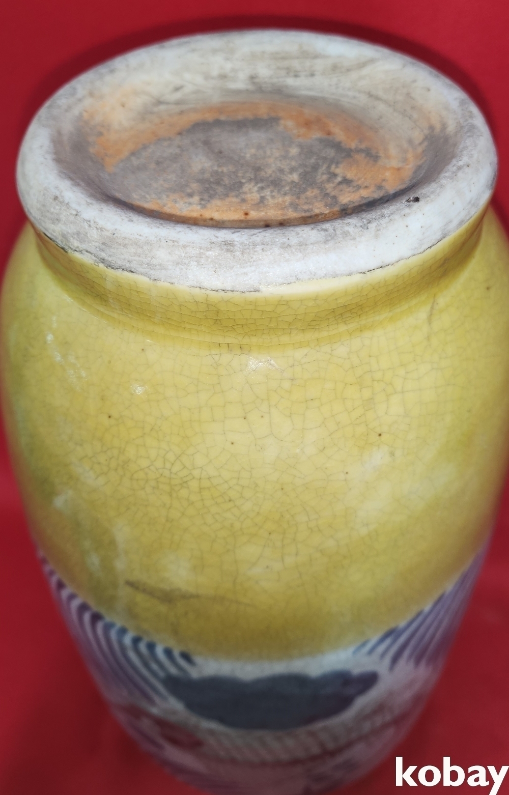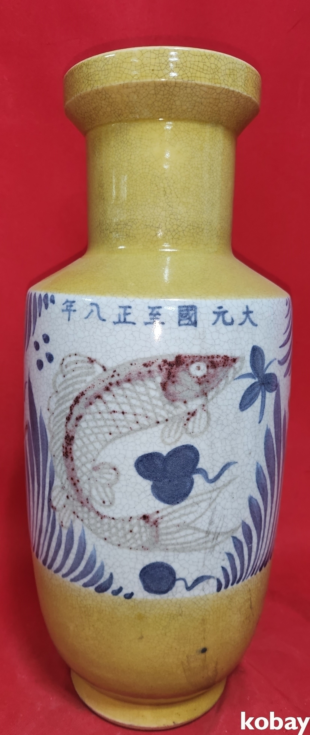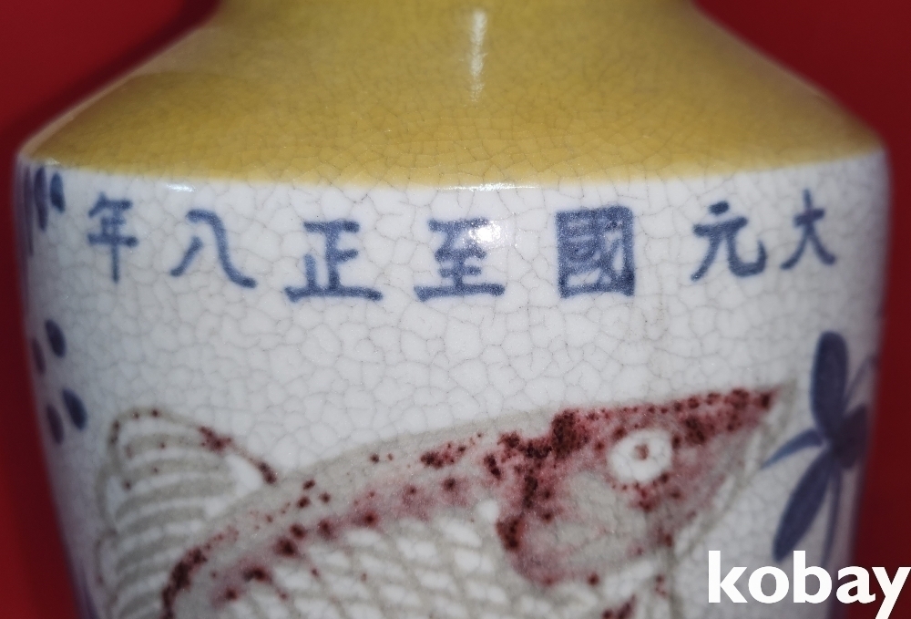 대원국지정팔년 관지 보이는 황지 바닥에 유리홍 쌍어문 문양 광구병입니다,