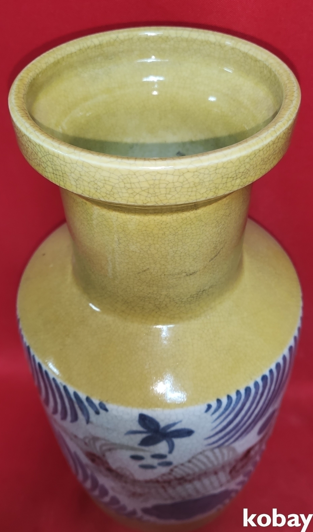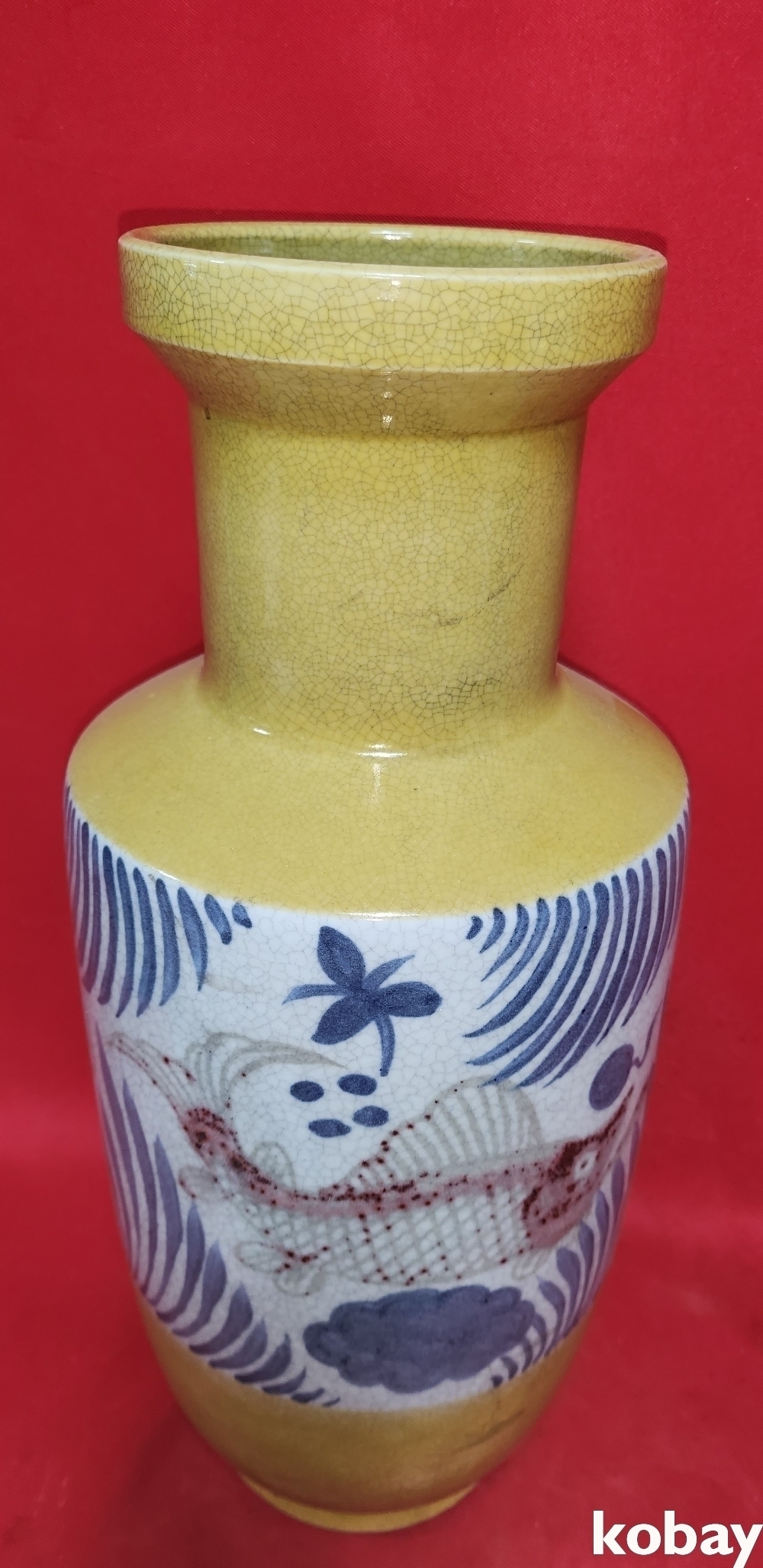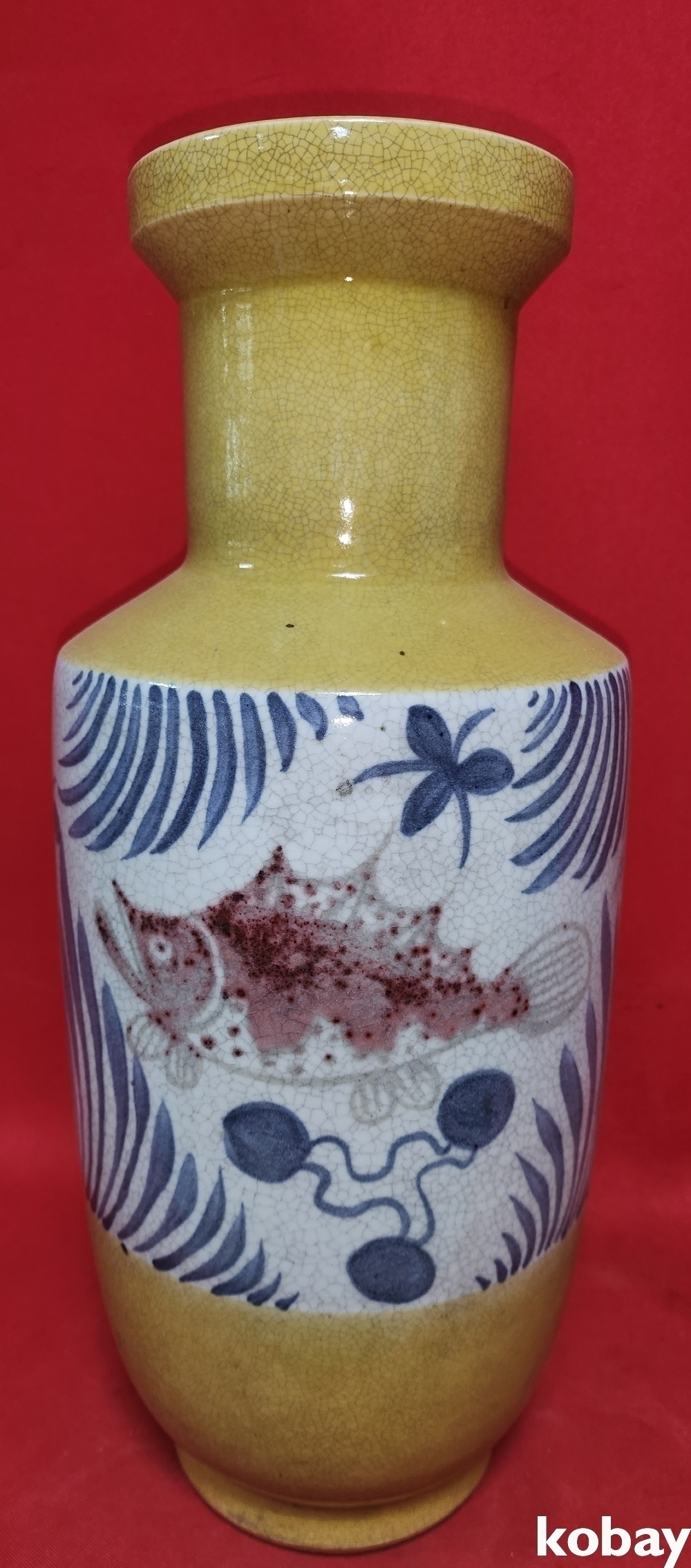 대원국지정팔년 관지 보이는 황지 바닥에 유리홍 쌍어문 문양 광구병입니다,