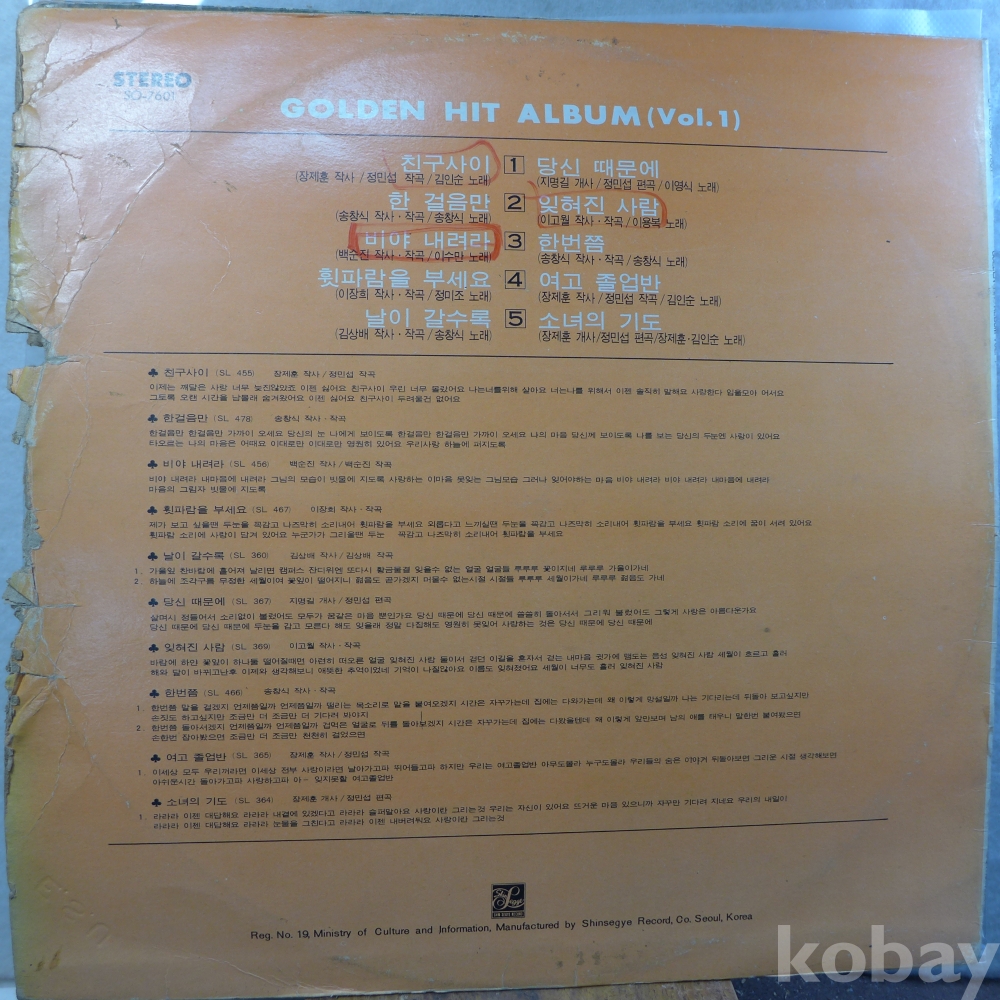 | 자켓상태 | P : 물에 젖거나 심한 훼손 | 음반상태 | EX : 재생에 영향 없는 가벼운 기스 존재 | 발매정보 | 초반 | 가사지여부 | 무 |