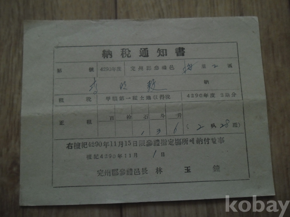 1957년 완주군삼례읍 납세통지서