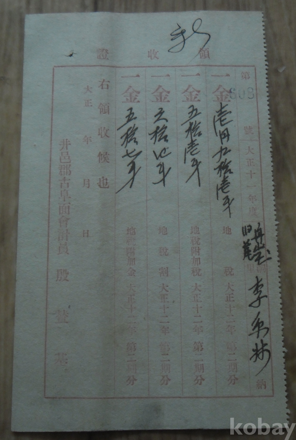 대정12년 정읍군고부면 발행 영수증