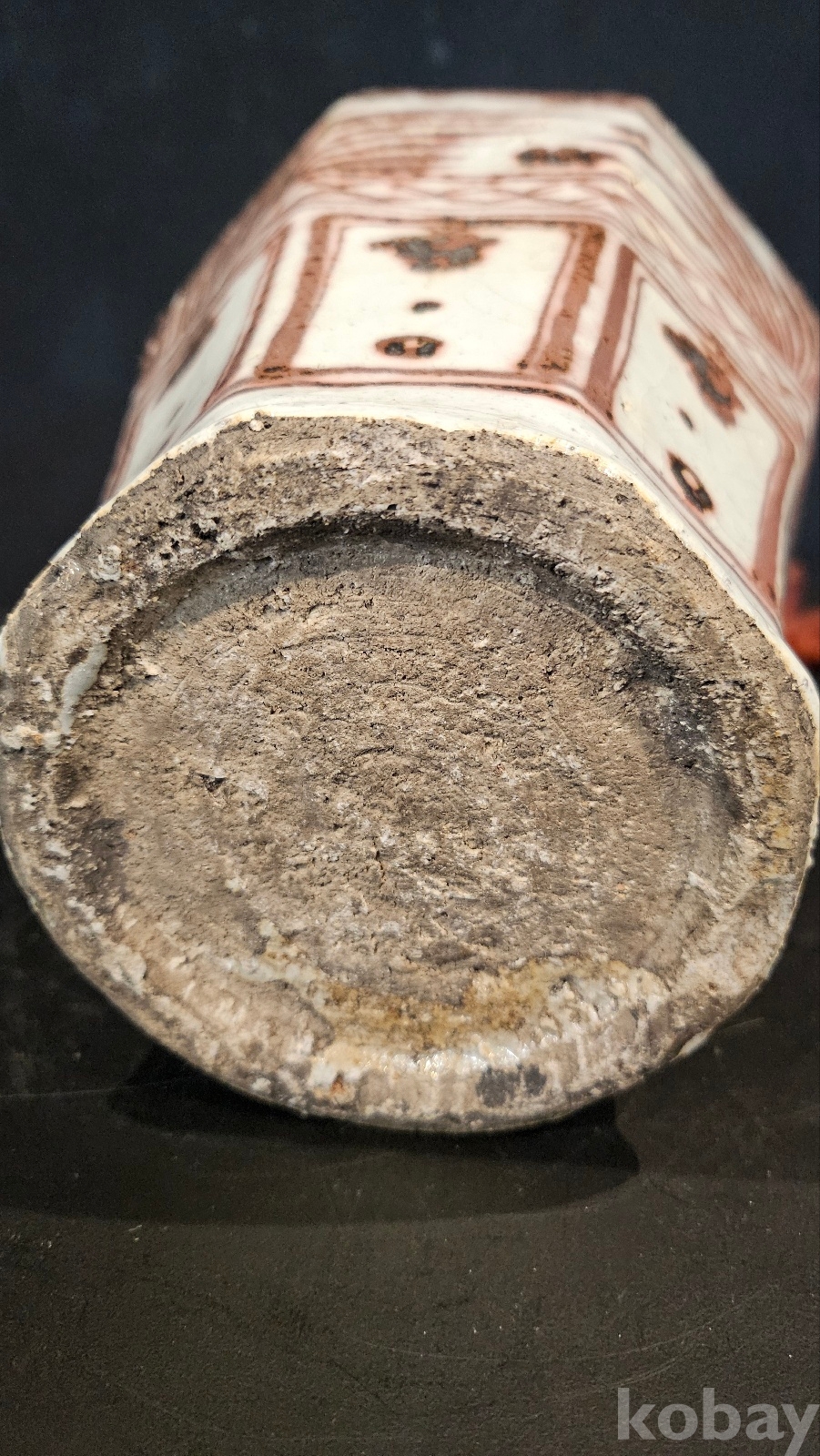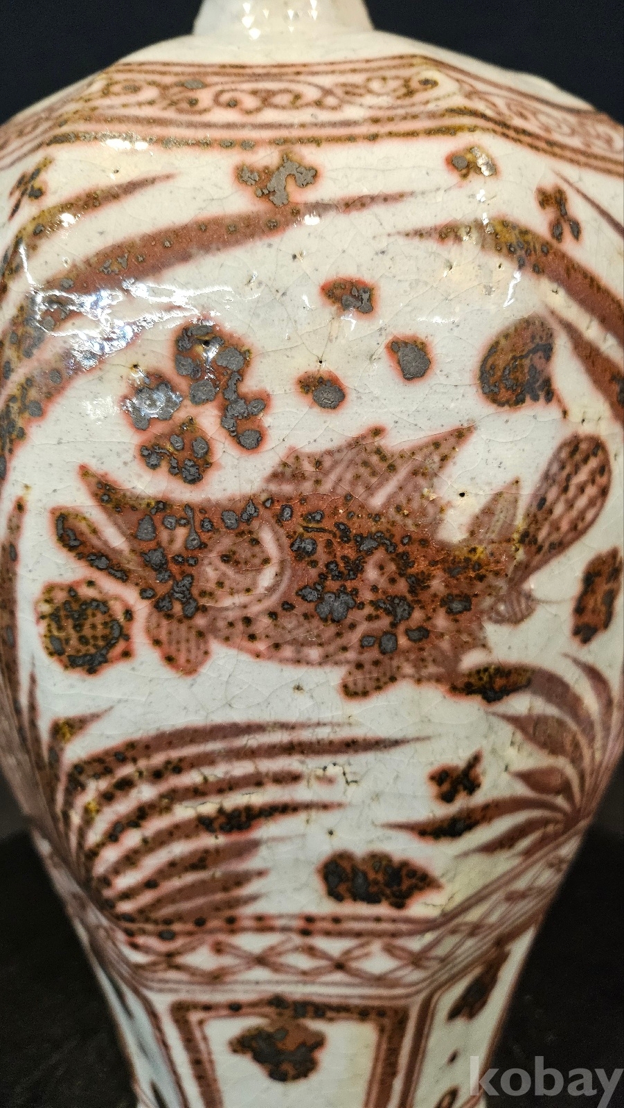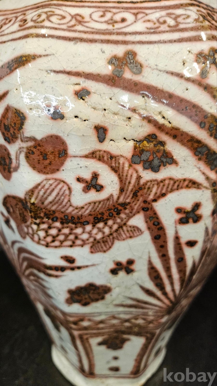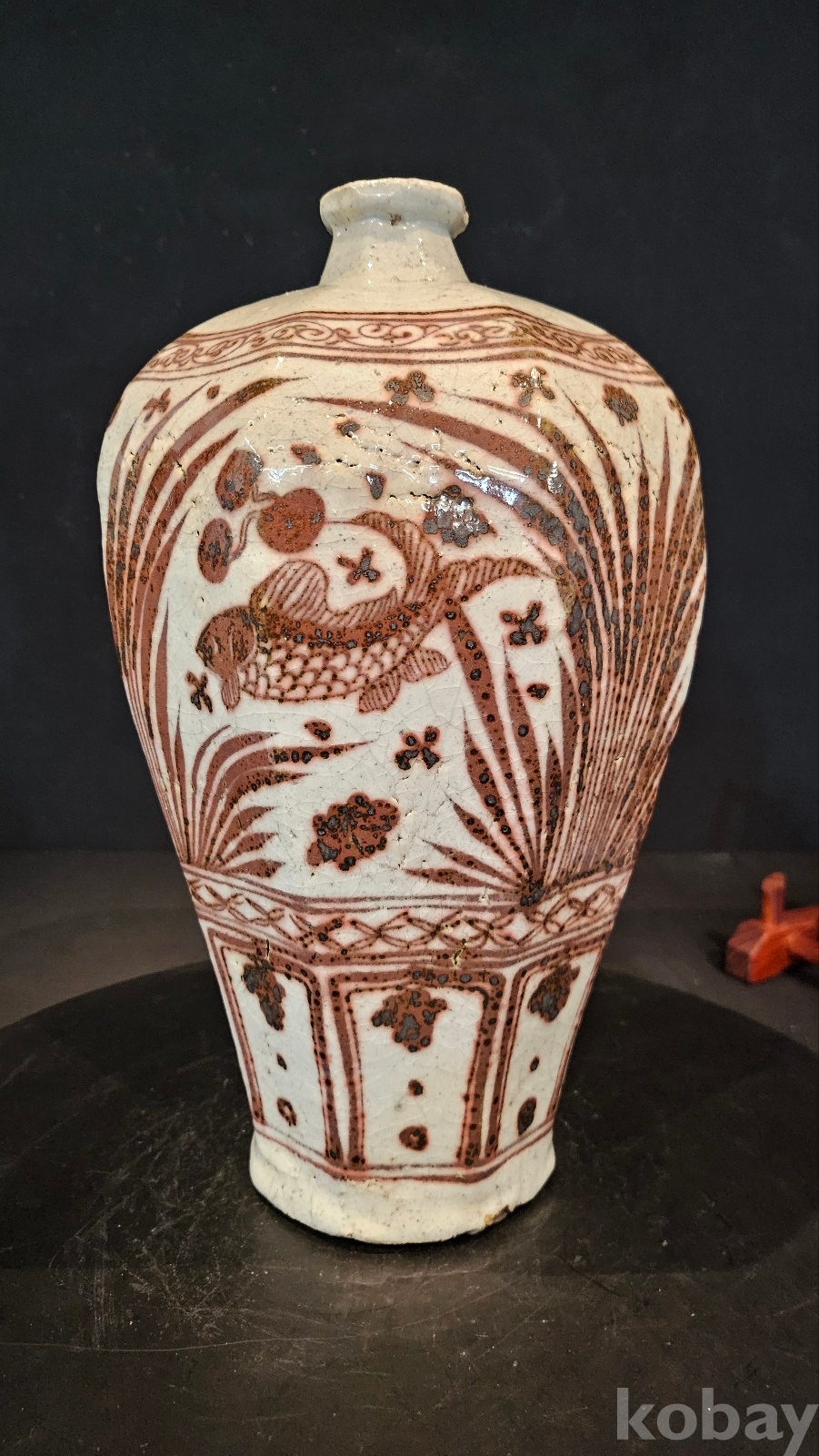 유리홍 기법은 원말기(14세기 중엽) 로 올라간다 구리안료를 태토위에 그리고 투명유 아래에서 고온소성 - 발색 실폐율이 높아 관요중심의 실험적 기법에 제작함 원대는 불안정. 명초기 홍무~영락년제에 기술이 정착됨 이 기물은 고난도 궁정자기이다