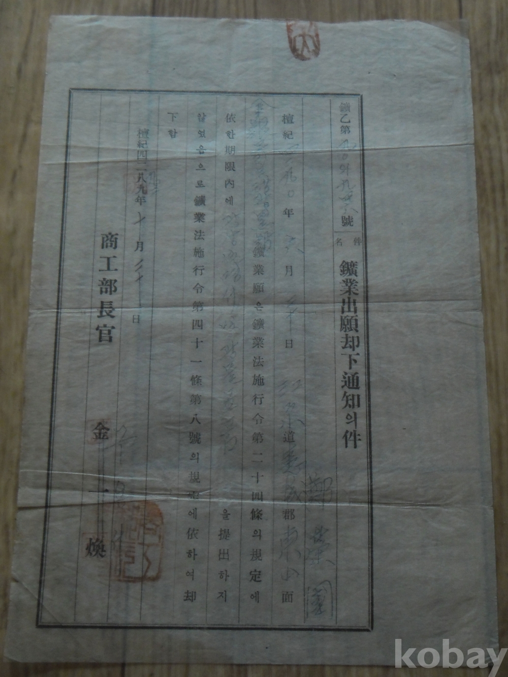 1959년 광업출원각하 통지서(강원)