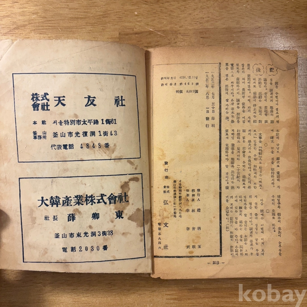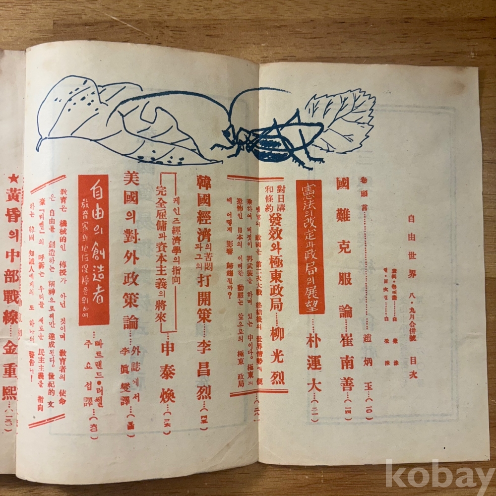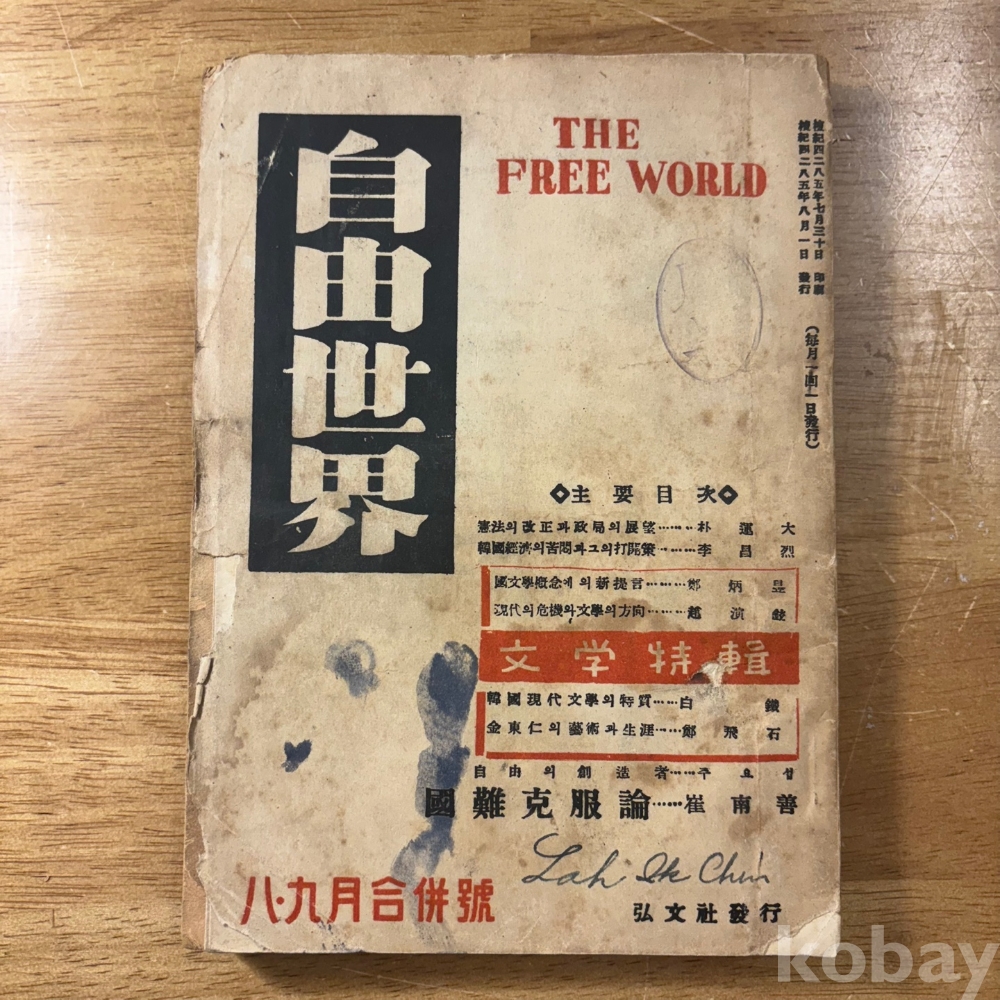 [희귀본, 한국현대사, 제1공화국, 헌법개정, 현대문학] <자유세계 1952년 8월&9월>, 1952, p. 212, 상태 중급(사진참조)