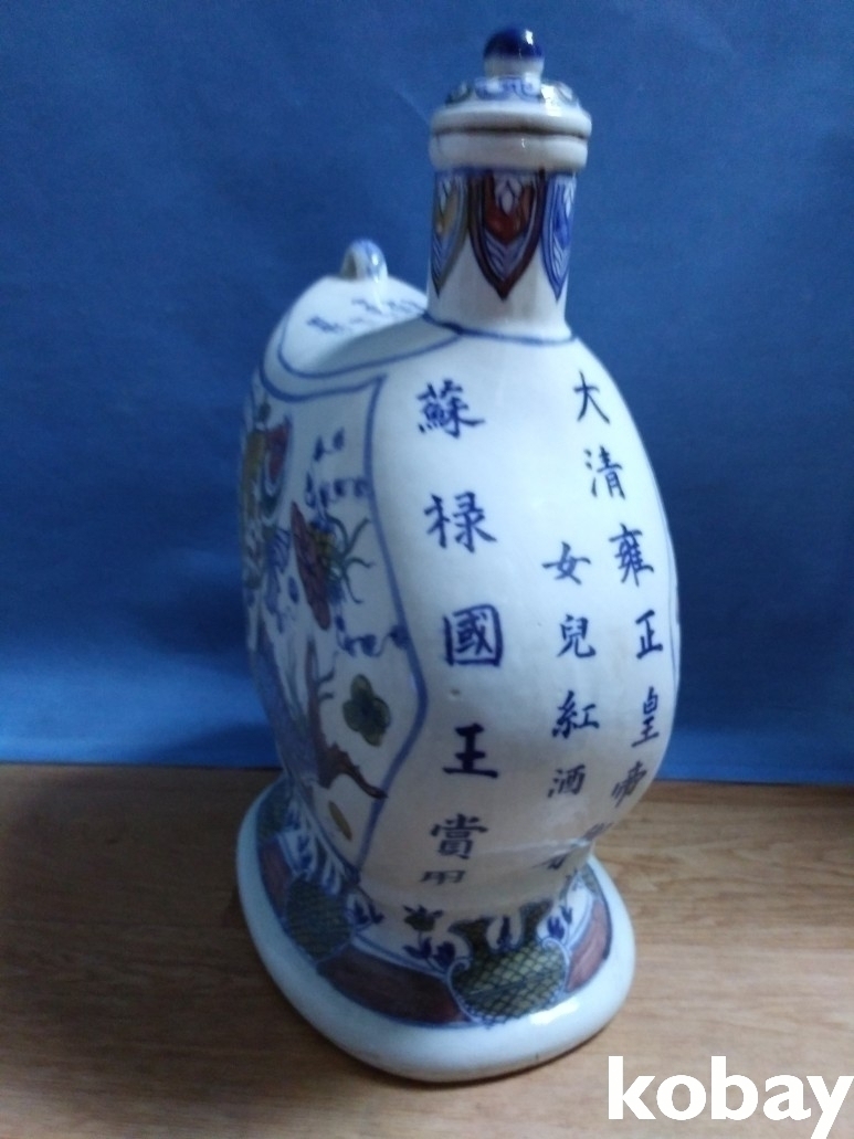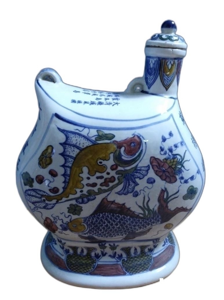 물고기 도안이 양면에 있는 술병 도자기 입니다.