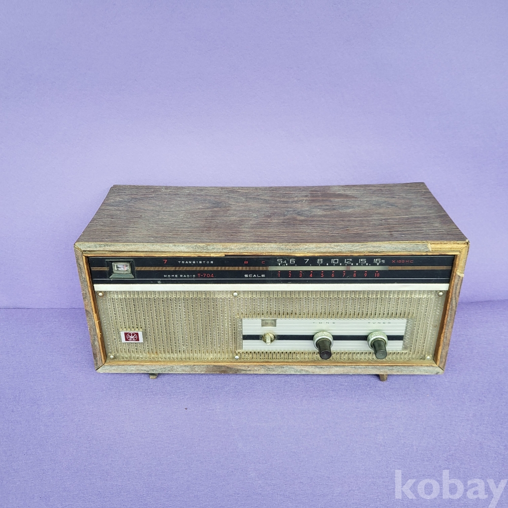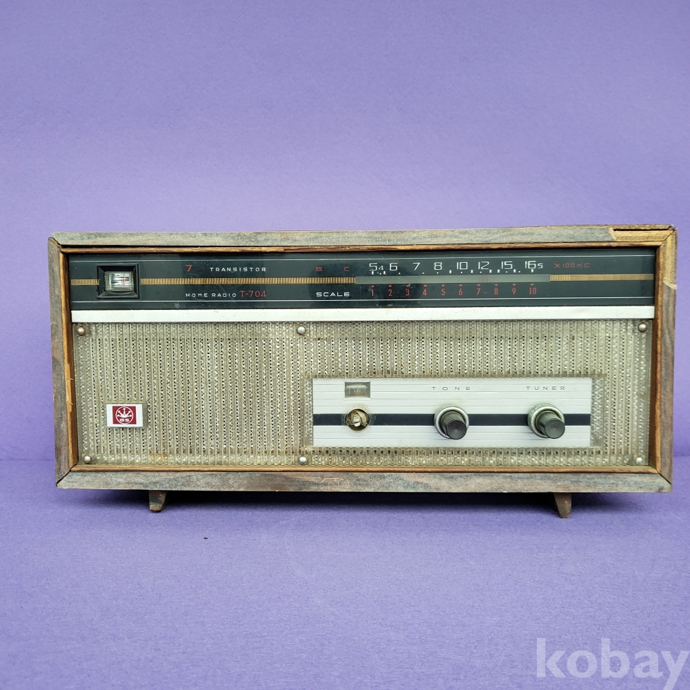 대한민국 전자산업의 태동기를 이끌었던 금성사(현 LG전자)의 역사적인 7석 트랜지스터 라디오, T-704 모델입니다. 전면의 투박하면서도 정겨운 디자인과 금성사 초창기의 상징인 '왕관 마크'가 선명합니다.