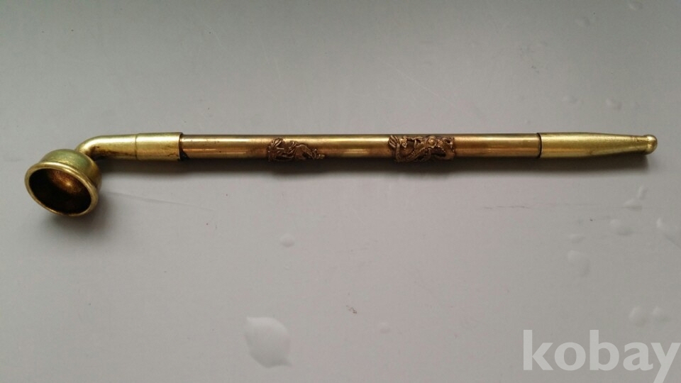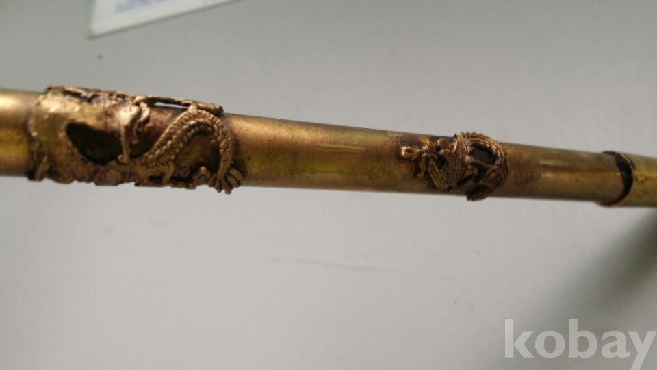 황동재질의 용문양이 장식되어 있는 담배대입니다. 특이하게도 2단으로 되어 있고 상태도 매우 좋습니다