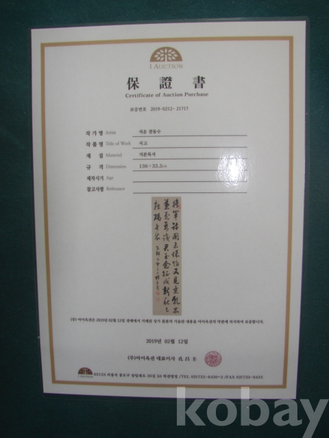 조선후기 서예가 석운 권동수(石雲 權東壽 1842~?(헌종 8~?))의 글씨 족자(작품: 32.5×133)입니다.