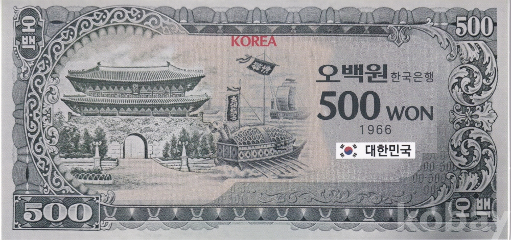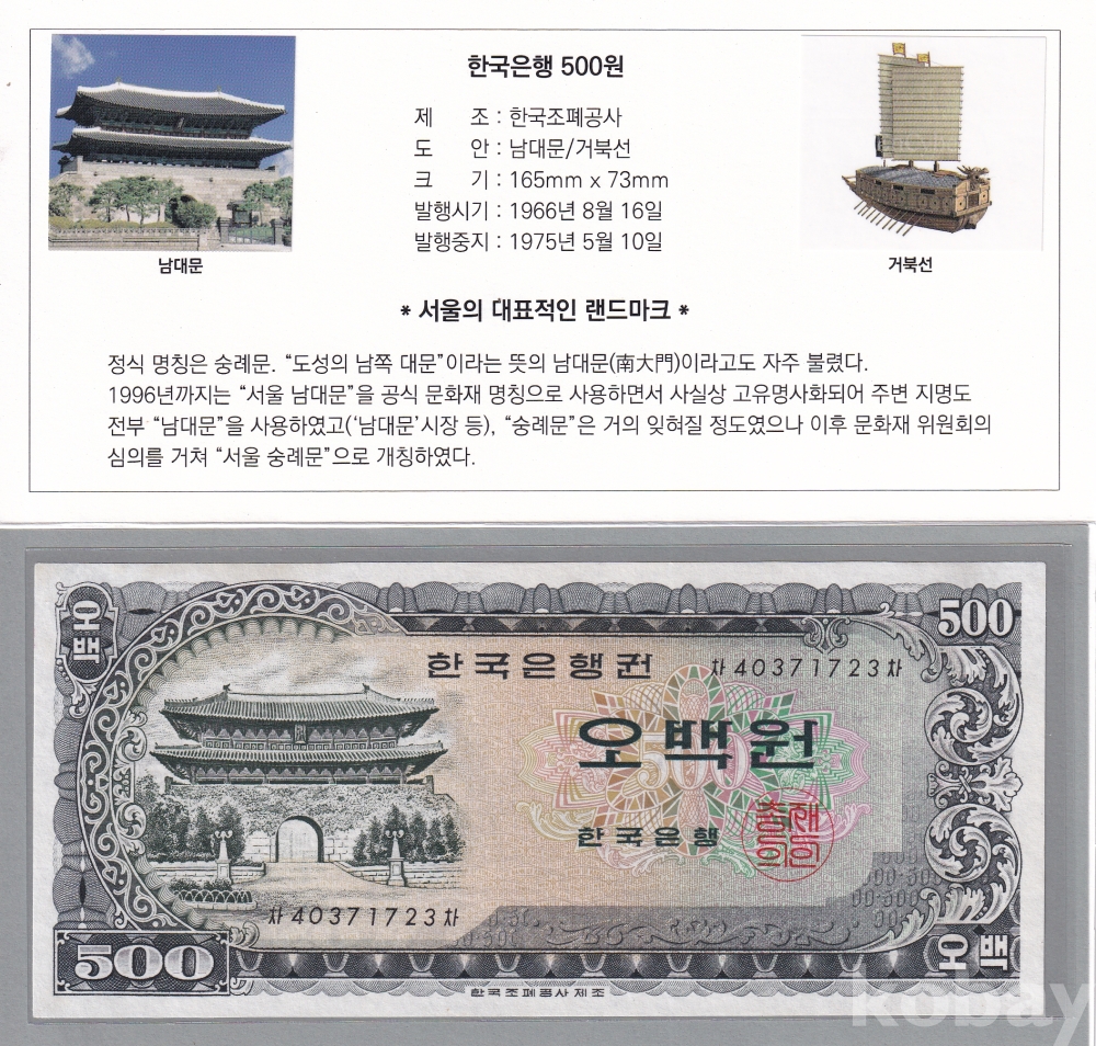 - 한국은행 1966년 남대문 오백원 미사용(-) 지폐 - 화폐첩 포함